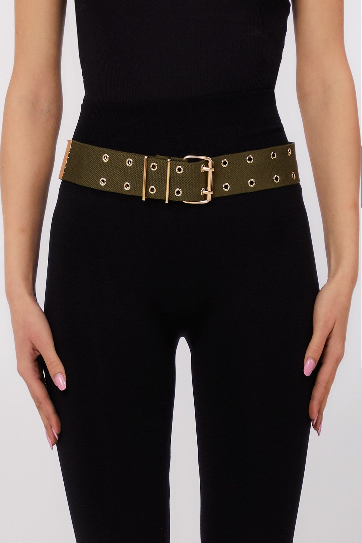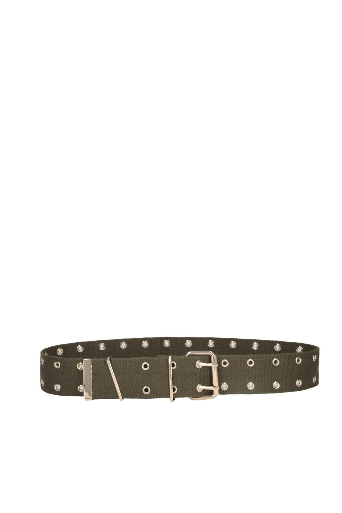 Utilitarian meets chic in this wide grommet belt, designed to cinch with both function and flair. Crafted with a textured fabric base and finished with gleaming hardware, it’s equal parts rugged and refined. Ideal for adding definition to oversized layers or elevating off-duty essentials.