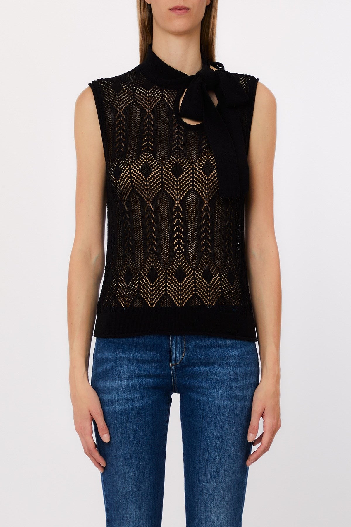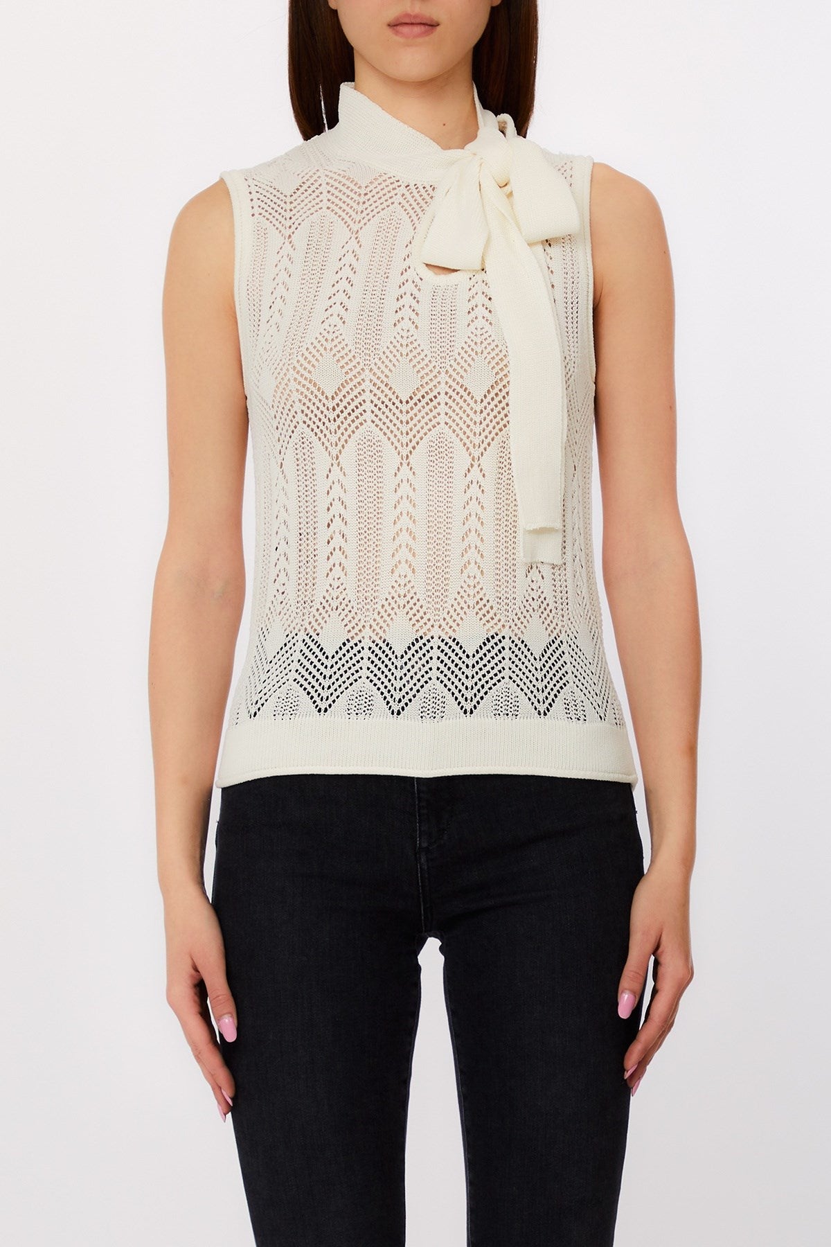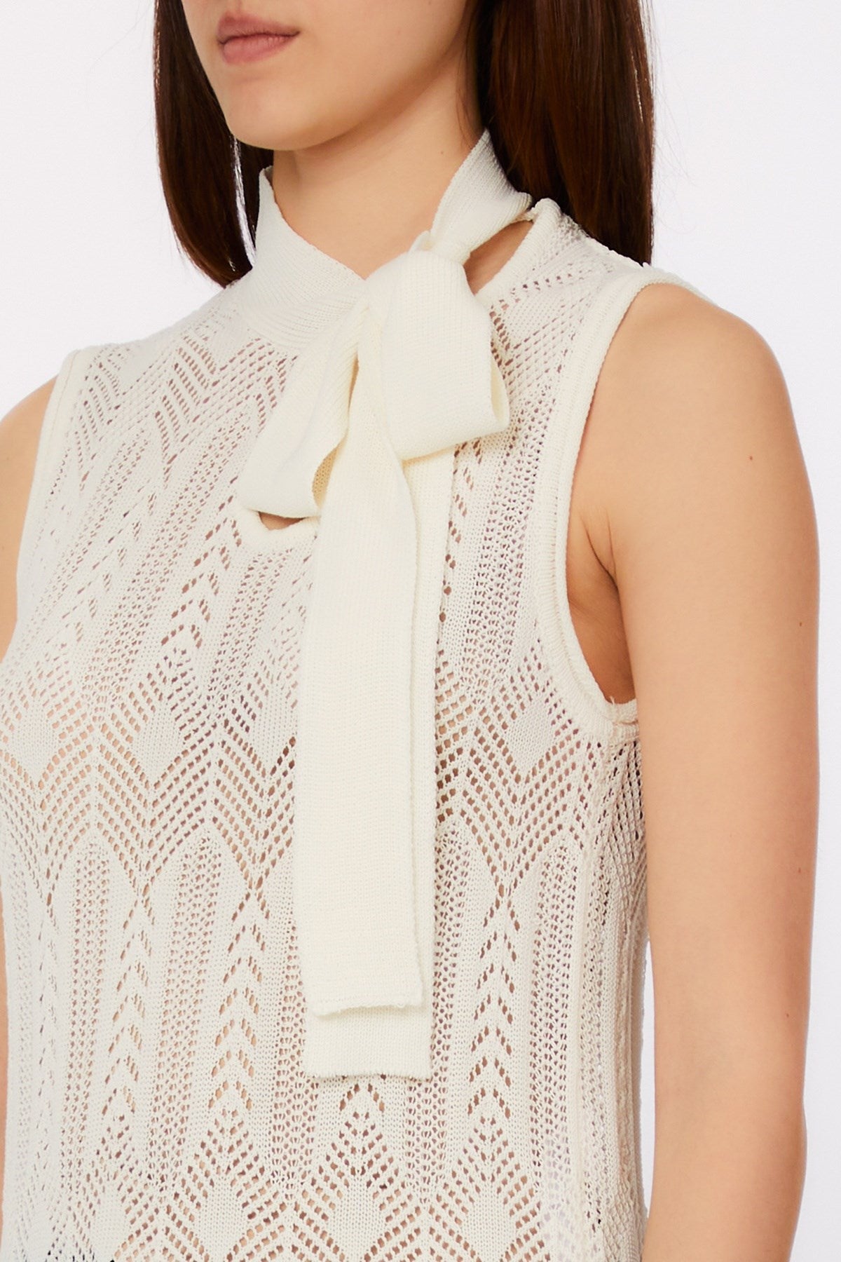 Delicately feminine with a touch of retro charm, this sleeveless knit top features a refined bow-tie neckline and intricate openwork patterning. The lightweight, sheer construction offers breezy elegance, perfect for layering or making a subtle statement. A versatile piece that moves effortlessly from office polish to weekend ease.