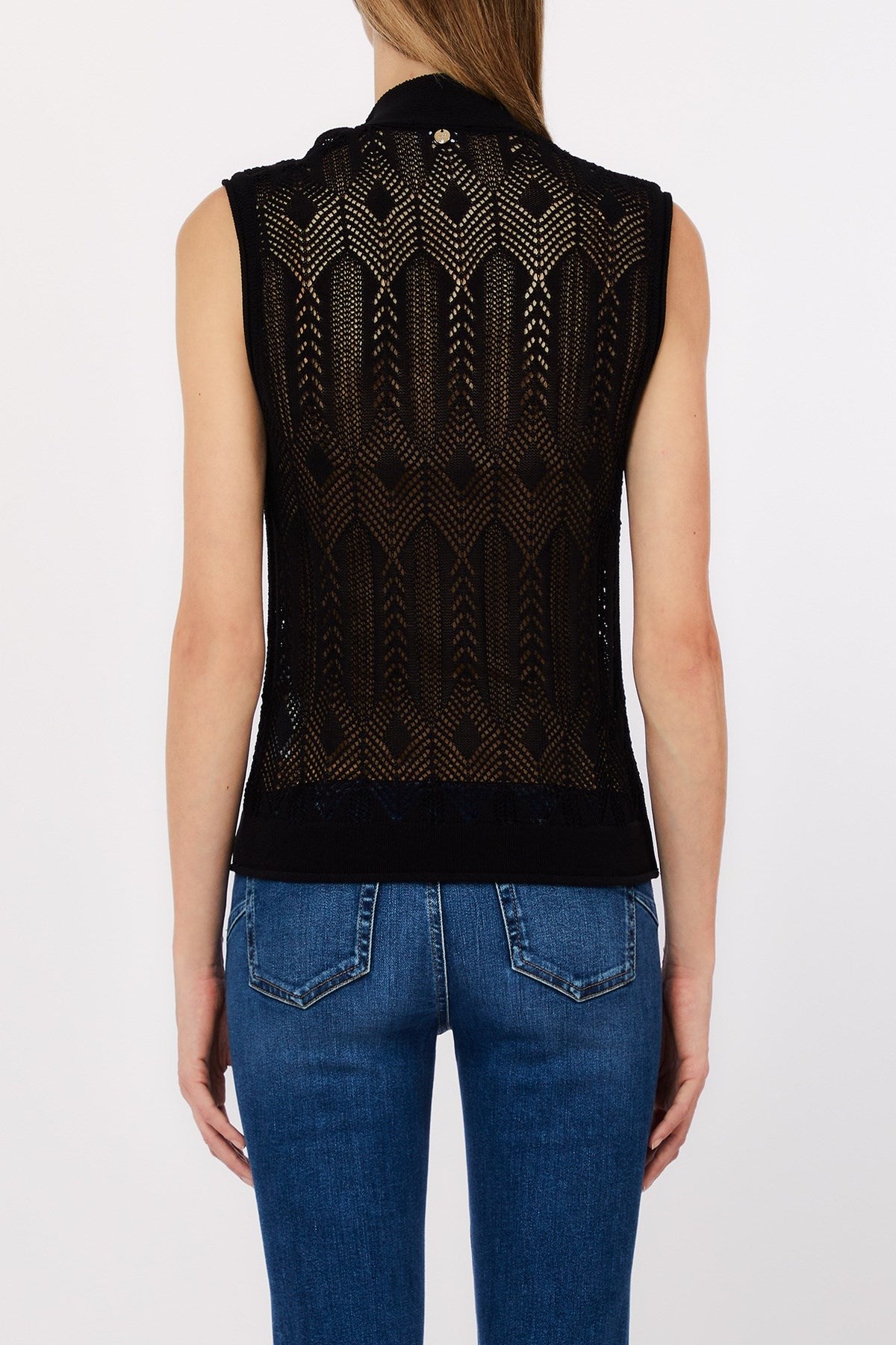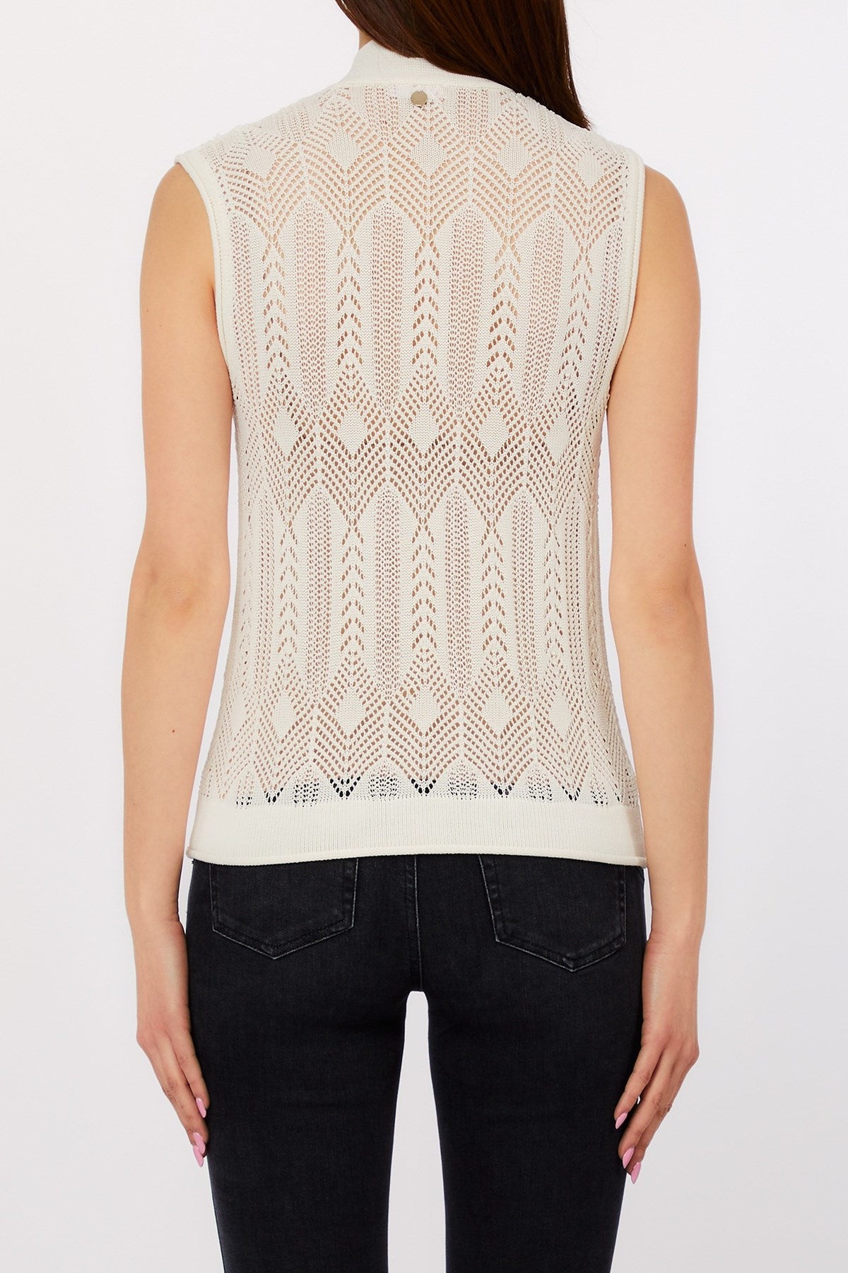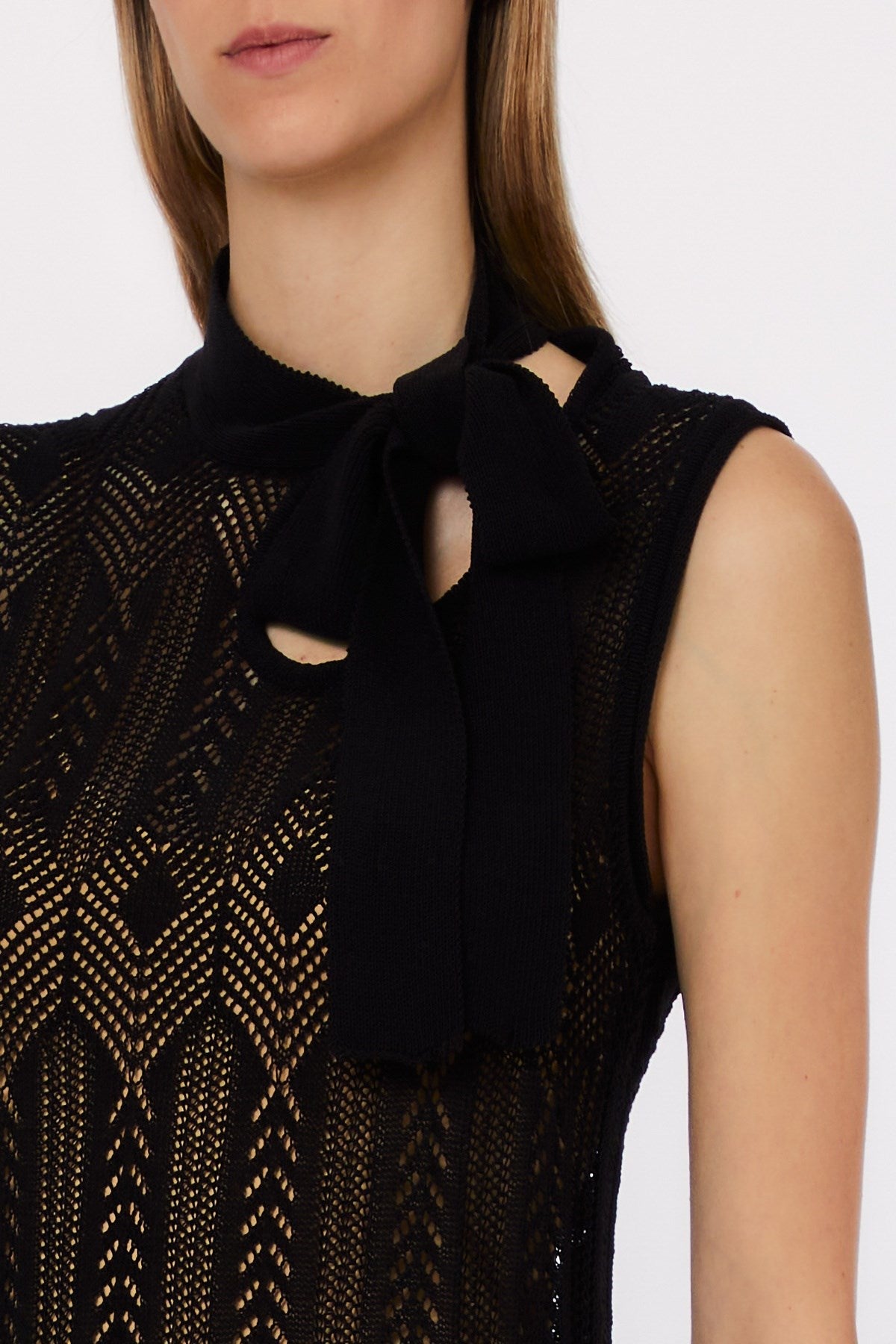 Delicately feminine with a touch of retro charm, this sleeveless knit top features a refined bow-tie neckline and intricate openwork patterning. The lightweight, sheer construction offers breezy elegance, perfect for layering or making a subtle statement. A versatile piece that moves effortlessly from office polish to weekend ease.