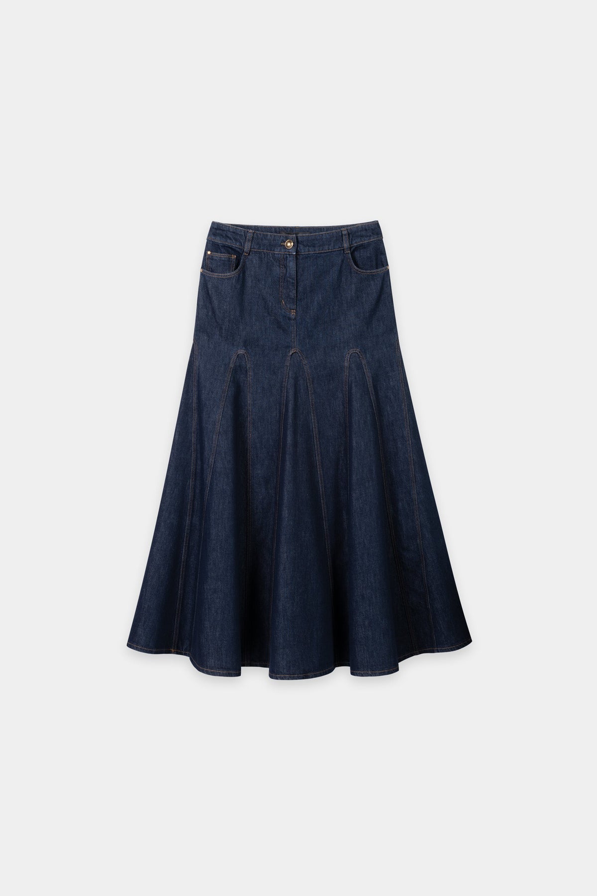 This flared denim skirt redefines classic cool with a modern twist. Featuring sharp panel inserts that create striking movement and volume, it’s finished with traditional five-pocket styling and a flattering high waist. It's a standout piece that swings effortlessly from day to night.