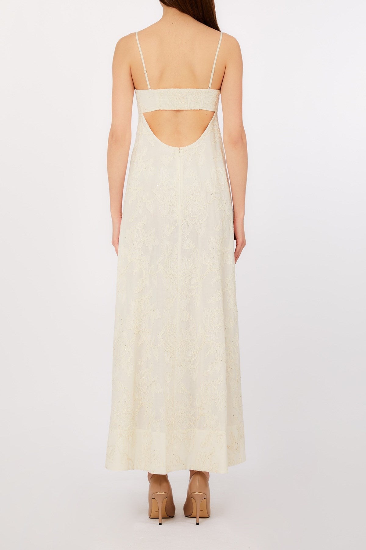 Ethereal and enchanting, this maxi dress features a delicate floral sequin pattern that shimmers softly across its sheer overlay. The minimalist bandeau bodice and slender straps flow into a romantic open back, creating a graceful silhouette with a touch of allure. Light, fluid, and quietly captivating—perfect for elegant soirées or warm-weather celebrations.