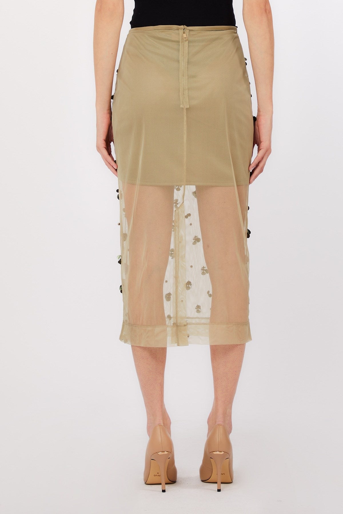 Delicately whimsical, this sheer midi skirt is adorned with shimmering floral appliqués that catch the light with every step. The semi-transparent overlay adds a playful sense of allure, while the clean silhouette keeps it refined. Perfect for elevating evening looks or layering with unexpected edge.