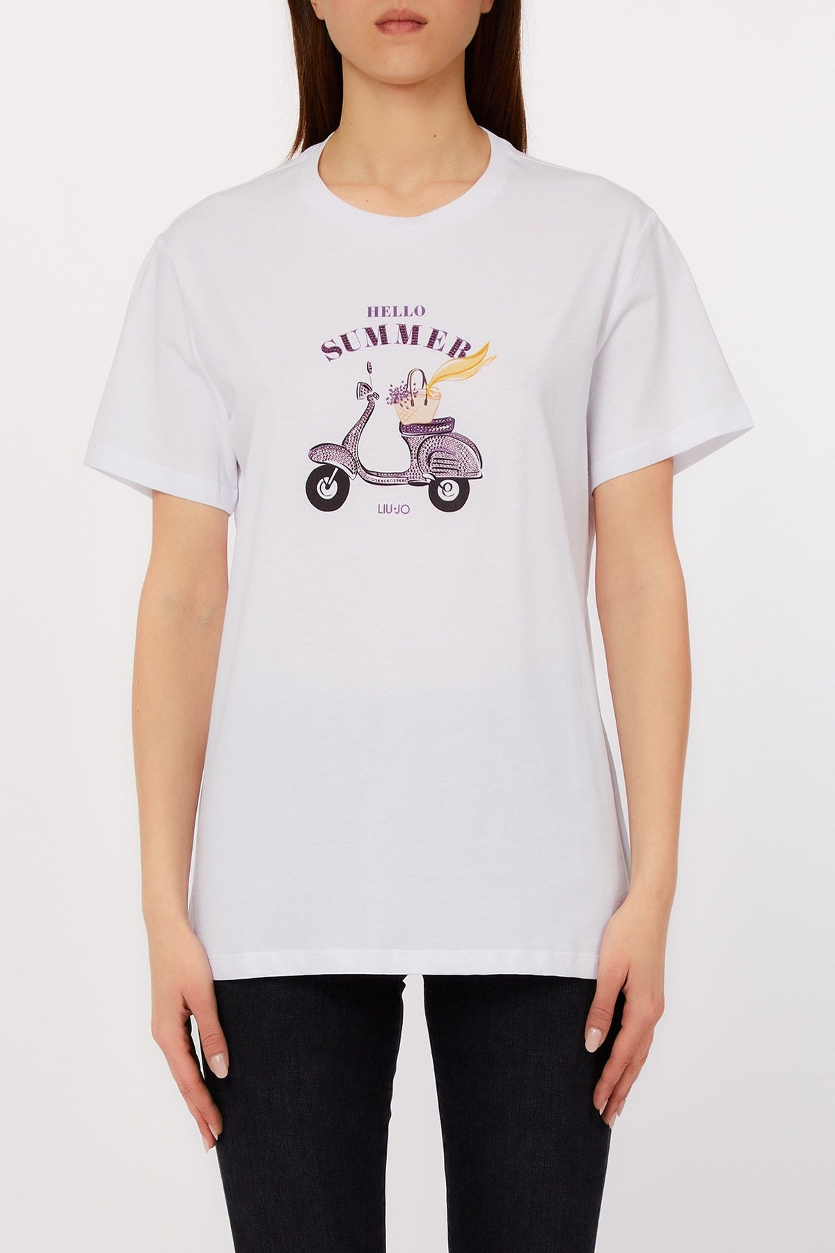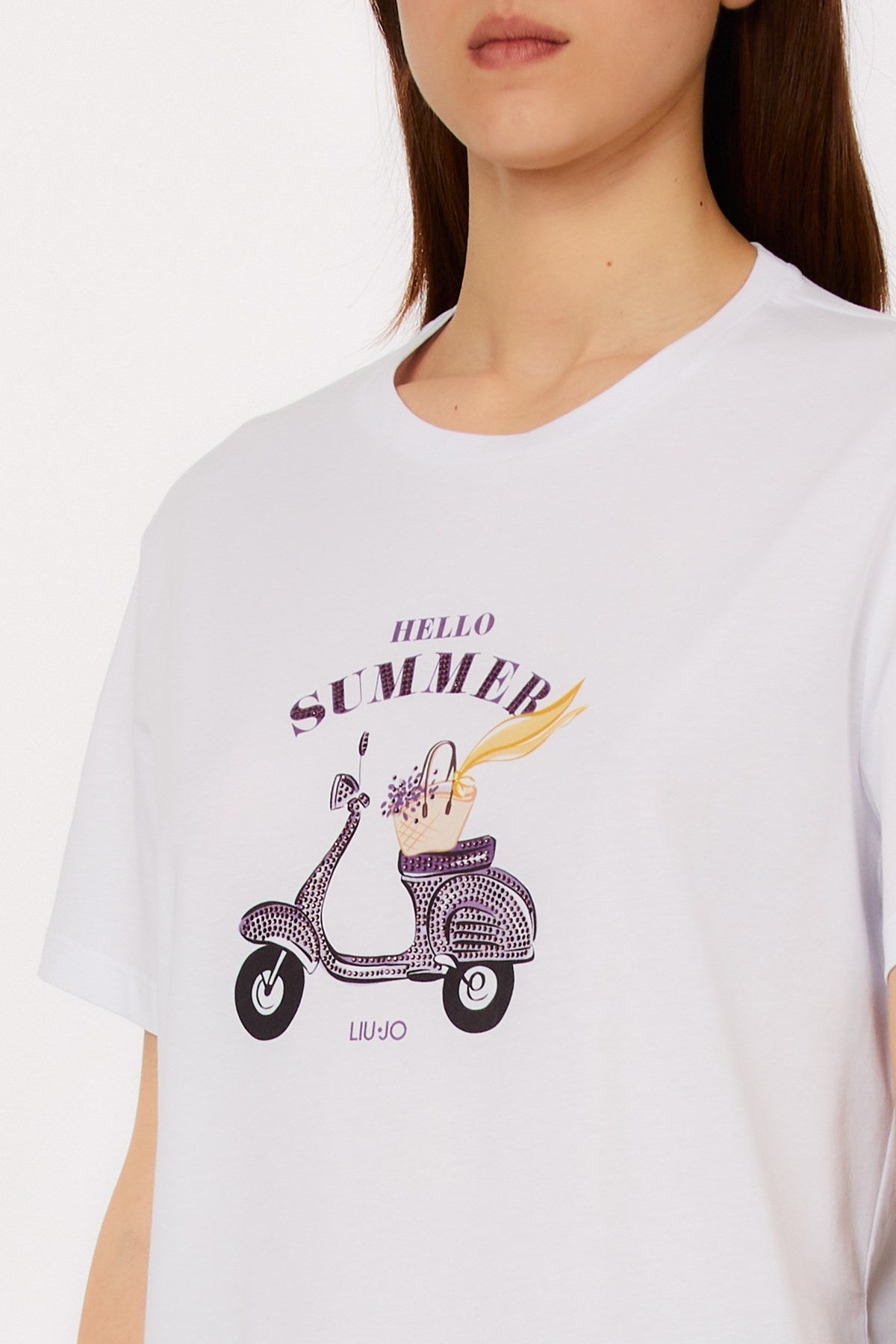 Playful and easygoing, this graphic tee features a sparkling scooter motif and a cheerful "Hello Summer" slogan that captures the spirit of the season. The relaxed fit and soft fabric make it a sunny-day essential. Perfect for pairing with denim or throwing over swimwear for a laid-back, chic vibe.