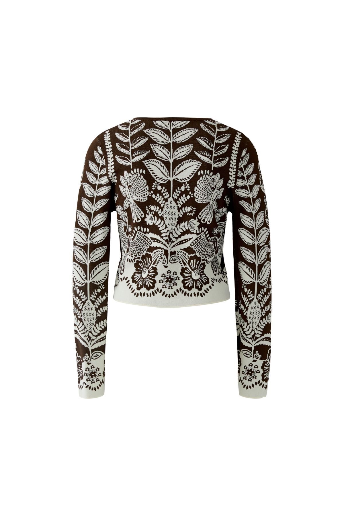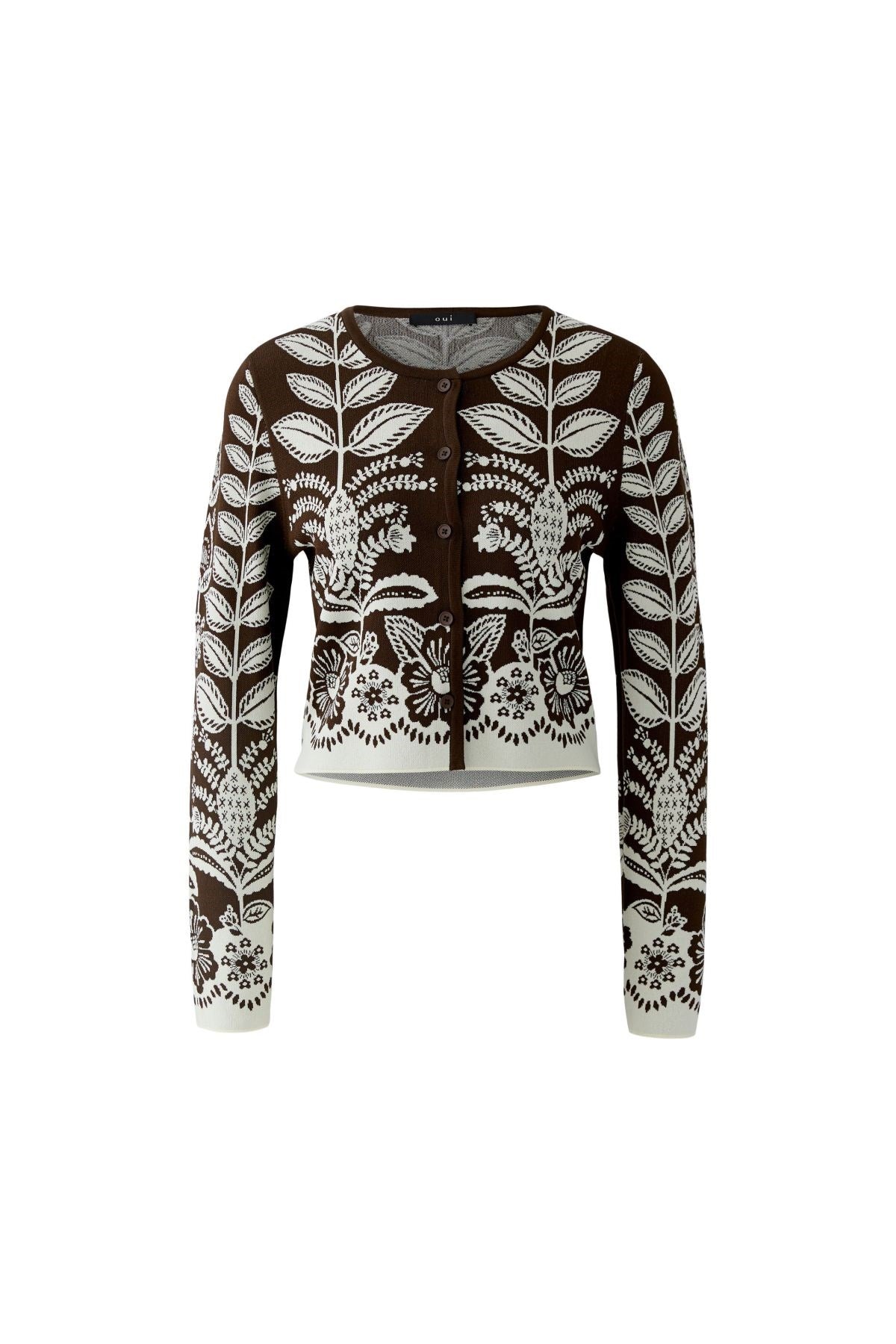 Richly patterned and effortlessly striking, this jacquard knit cardigan is a standout layering piece with folk-inspired charm. The cropped fit and classic crew neckline balance bold floral motifs with feminine flair. Button it up for polish or wear open for relaxed elegance.