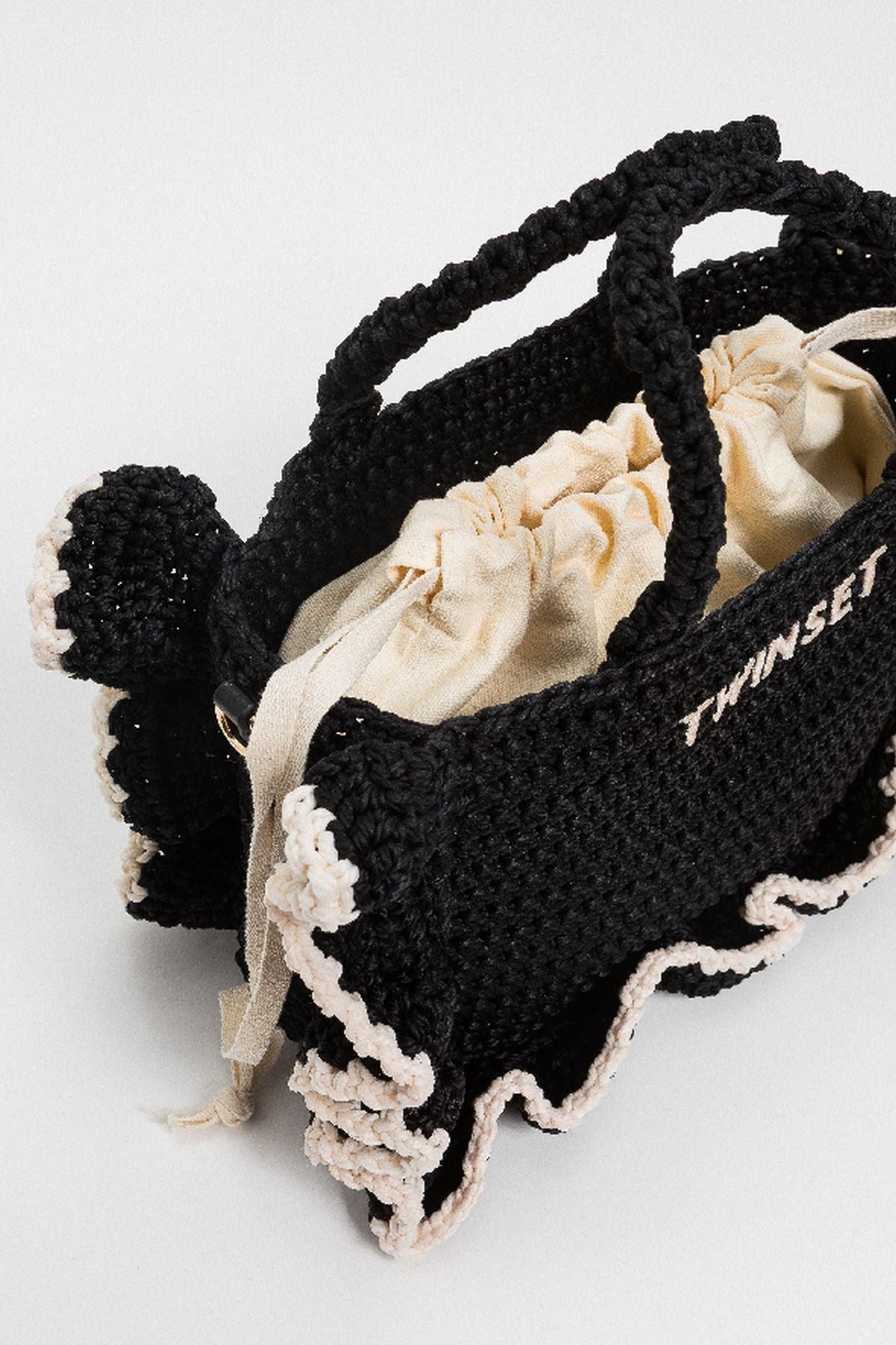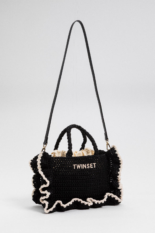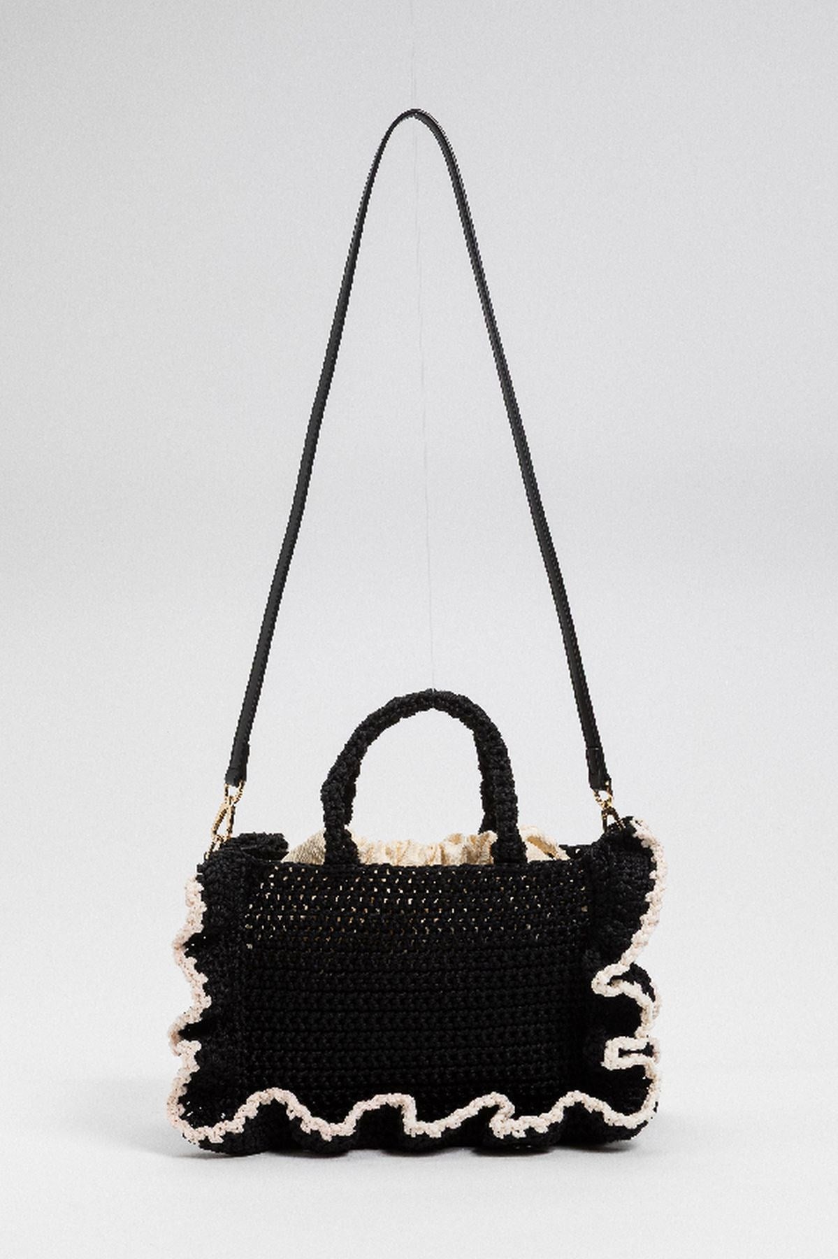 Vibrant and delightfully textured, this crochet handbag brings playful energy with its soft ruffled trim and contrasting edges. The structured mini shape is balanced by a detachable strap and top handles for versatile styling. A charming companion for sunny strolls and weekend escapes.