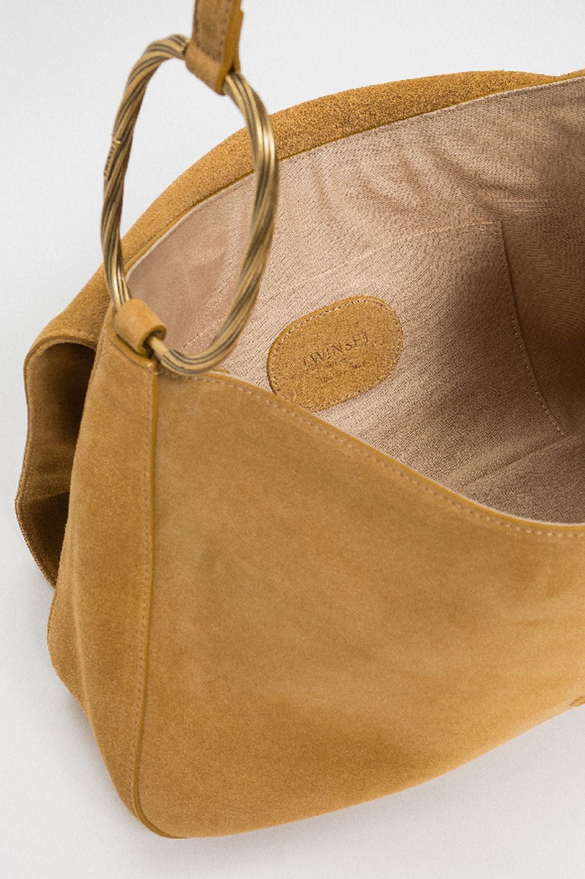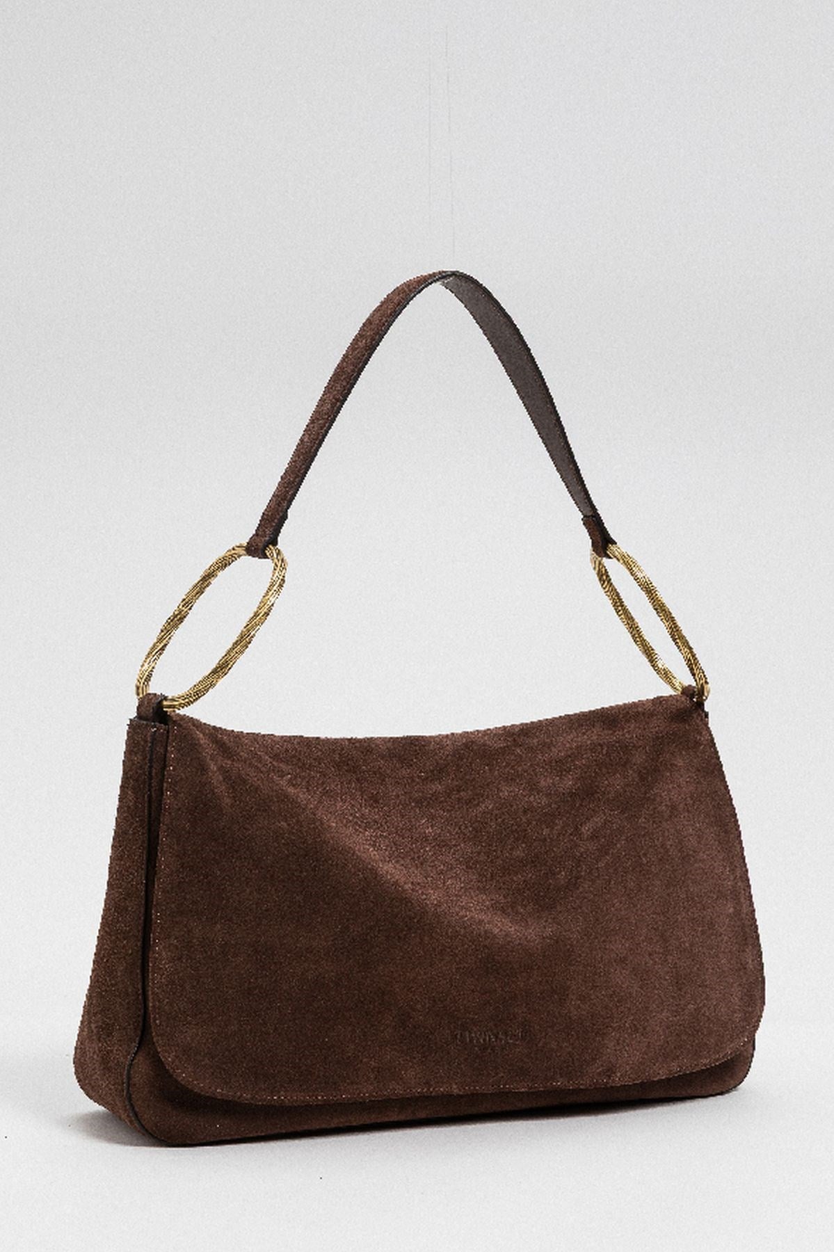 Bold and refined, this suede shoulder bag makes a luxe statement with its sculptural gold-tone hardware and soft, curved flap design. The rich texture adds depth, while the twisted metal rings bring a touch of vintage glamour. An elegant companion for evenings out or elevating daytime looks.