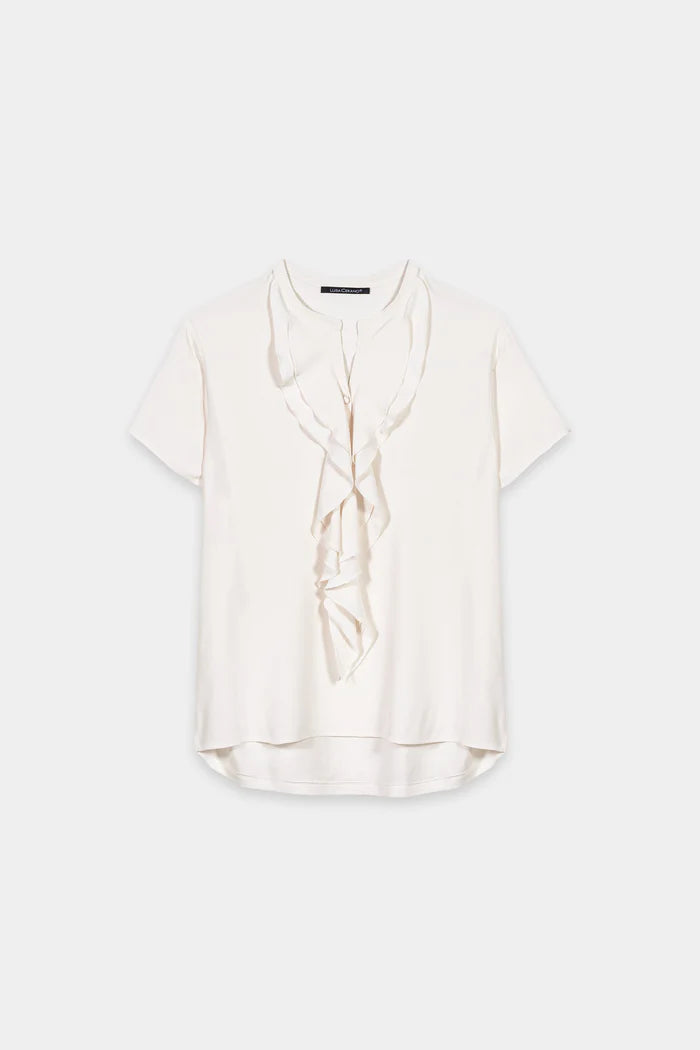 Delicately fluid, this blouse charms with a cascading ruffle neckline that adds soft movement and elegance. The lightweight fabric and short sleeves make it a breezy yet refined choice for both office and occasion. An effortless way to add romance to any look.