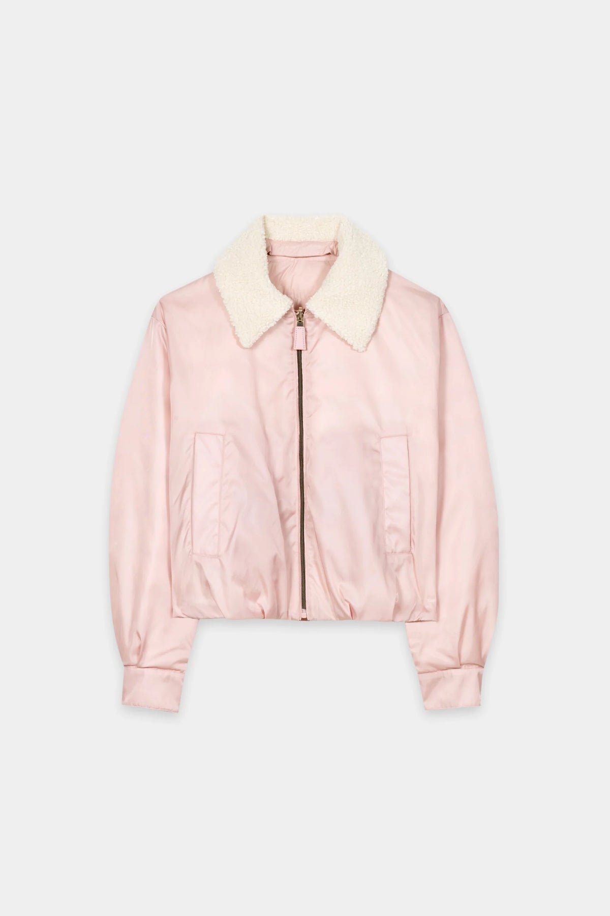 Classic with a cozy twist, this bomber-style jacket features a plush shearling collar that contrasts beautifully with its sleek, structured body. The cropped hem and subtle gathering add a modern edge to its timeless silhouette. Effortlessly cool and perfect for layering through transitional weather.