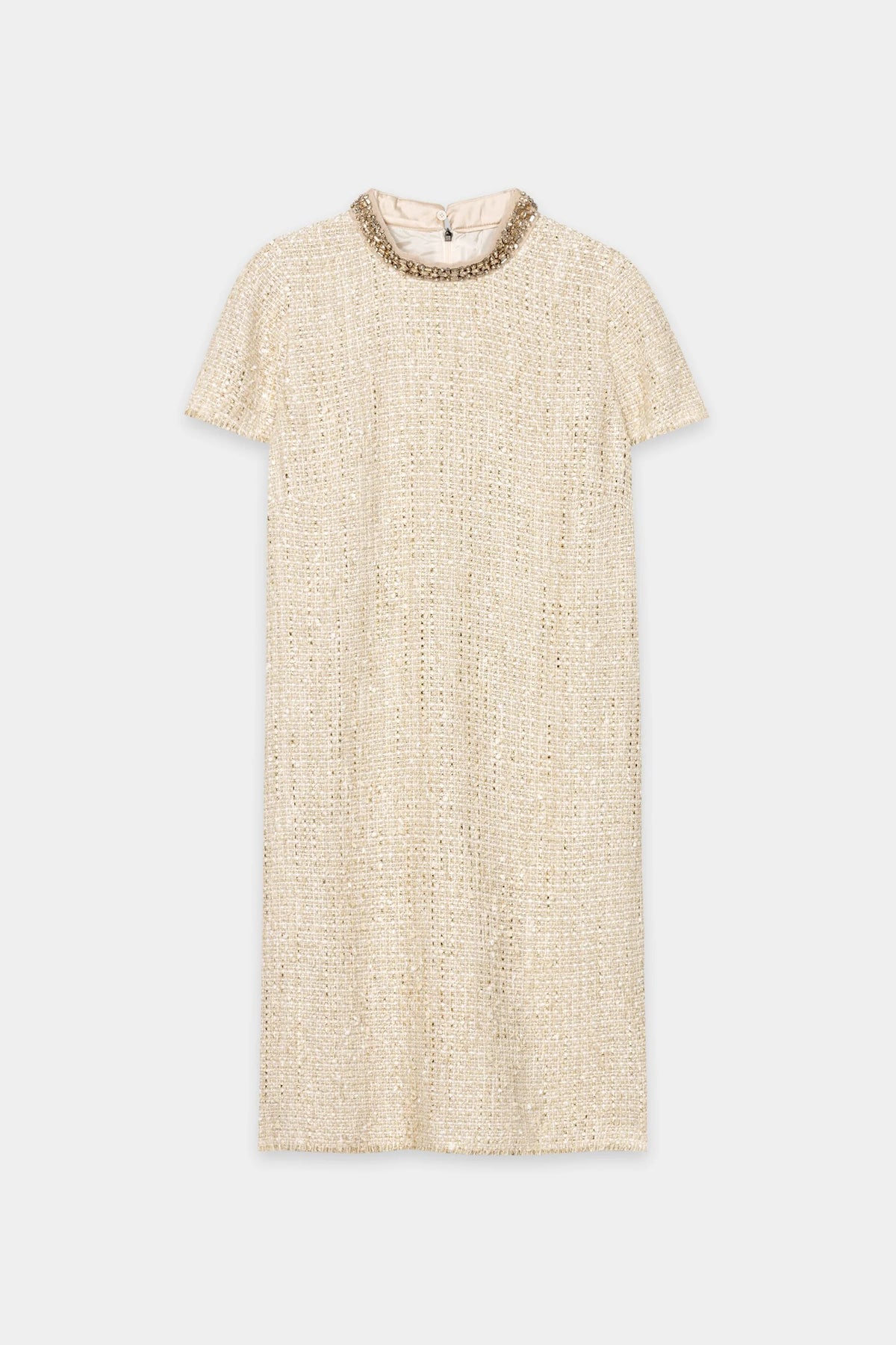 Refined and radiant, this shift dress features a rich tweed texture paired with a jewel-embellished neckline for instant elegance. Its clean silhouette and short sleeves keep the look modern and effortless. A perfect choice for special occasions or elevated daywear with a polished twist.