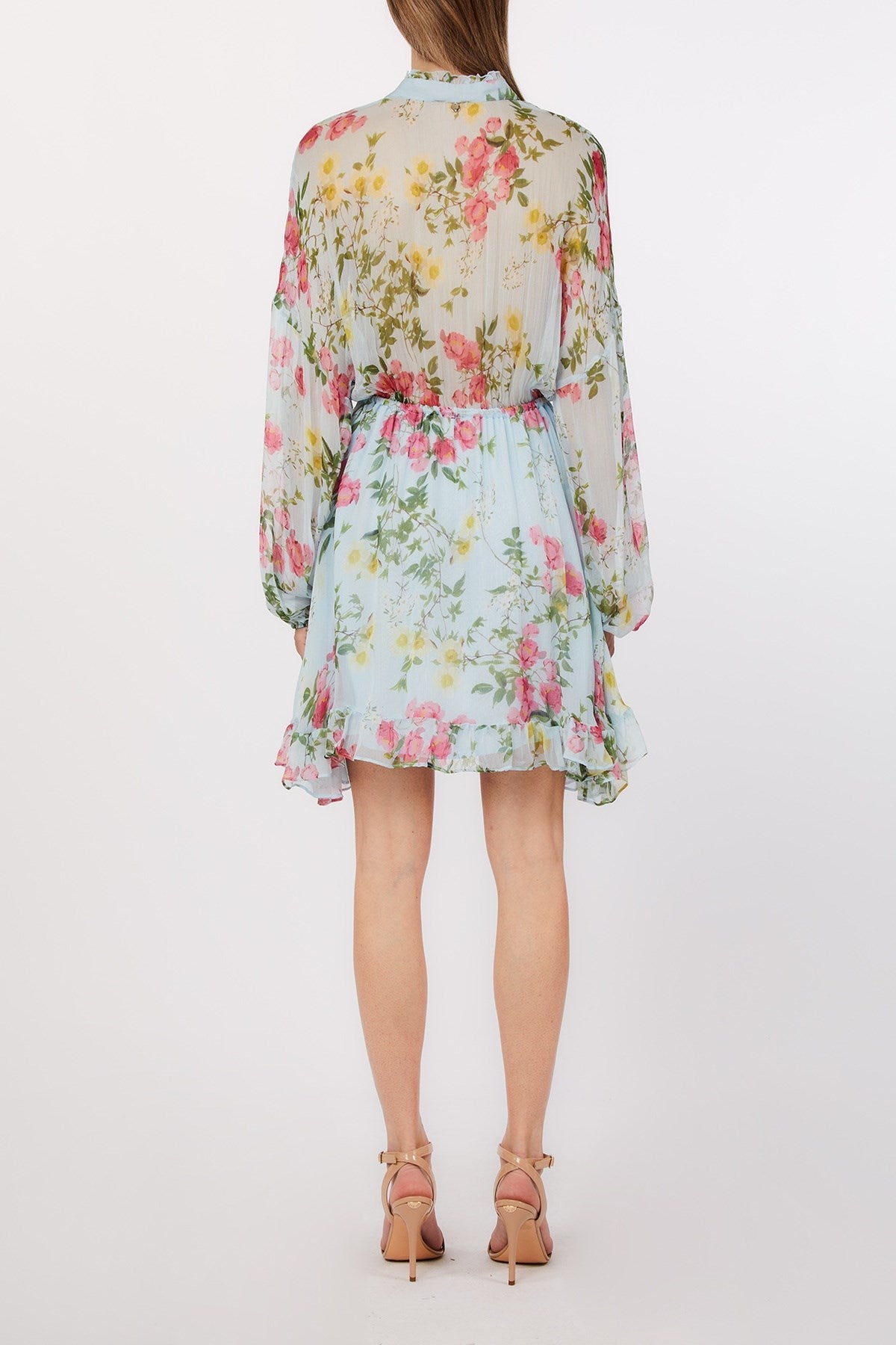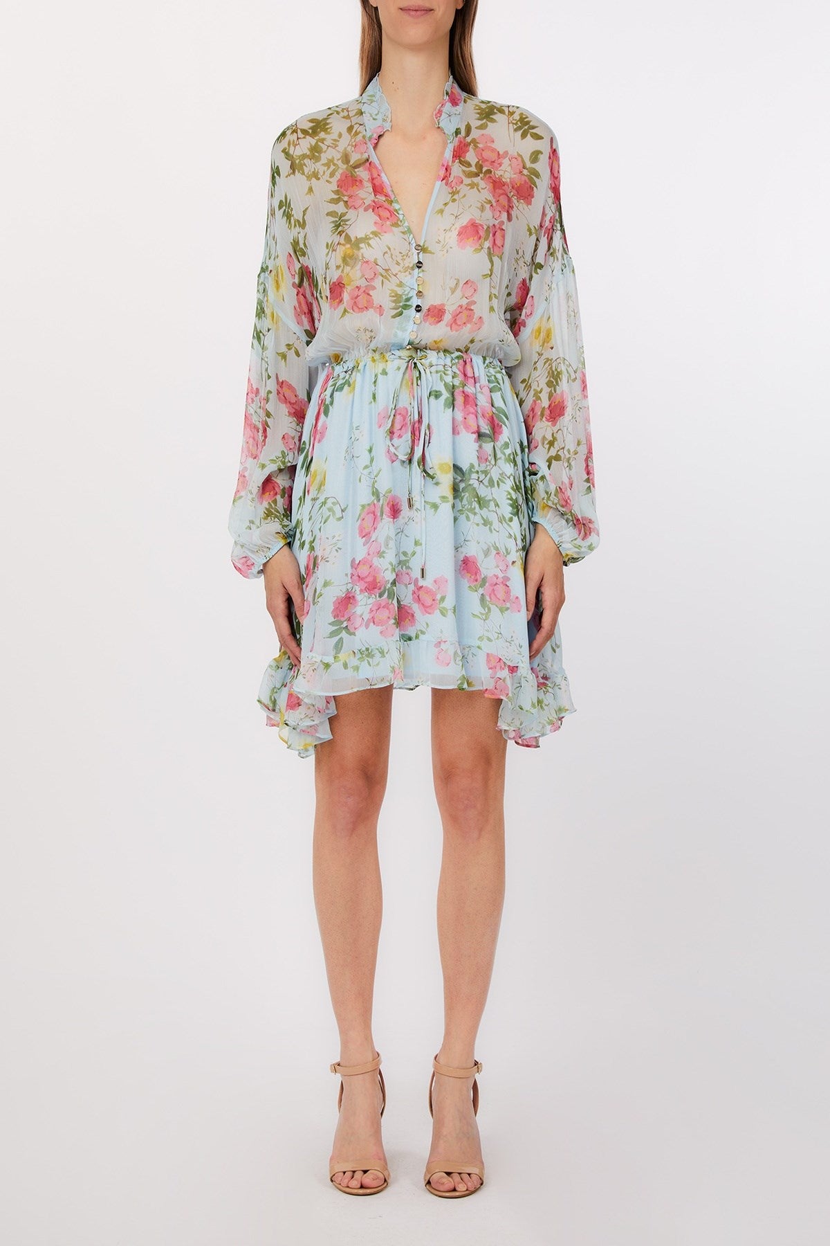 Effortlessly romantic, this chiffon mini dress floats with soft ruffles and a dreamy floral print that feels like spring in motion. The cinched waist and delicate buttoned bodice lend a flattering shape, while billowy sleeves add an ethereal finish. Perfect for garden parties, coastal getaways, or sun-drenched strolls.