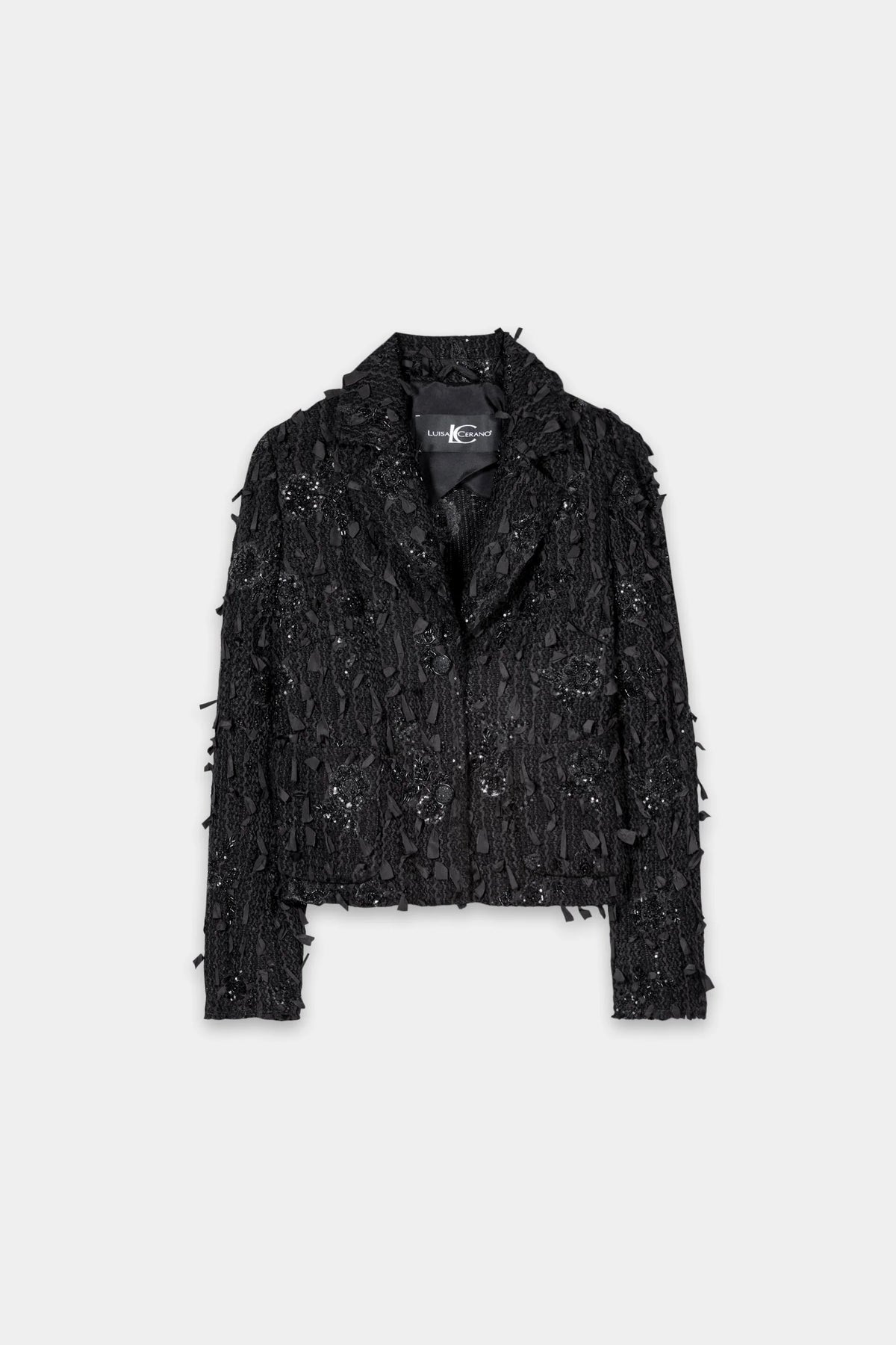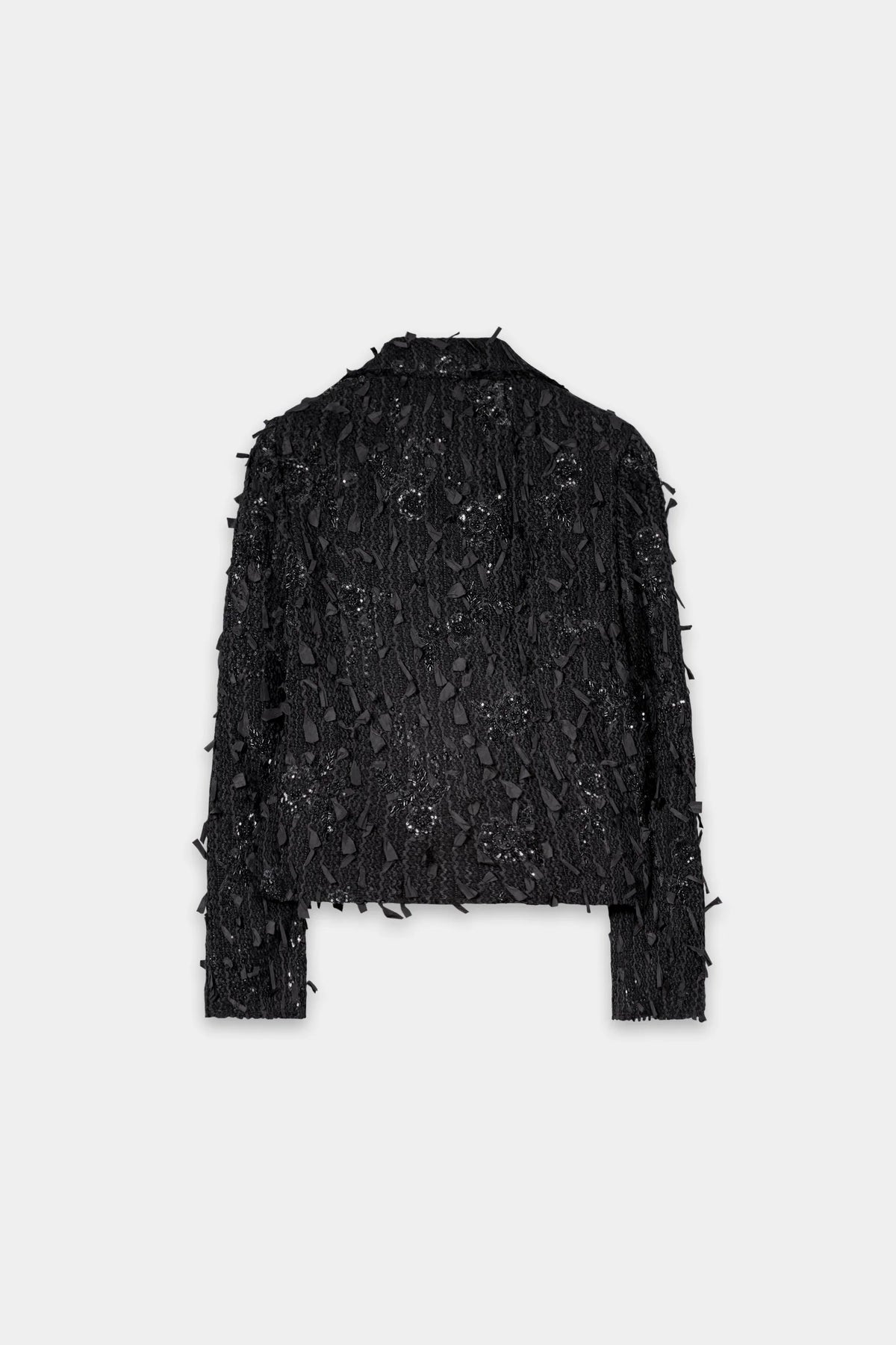 Rich in texture and sparkle, this statement blazer is adorned with intricate embellishments and tonal appliqué for a dramatic, couture-like finish. Its tailored cut is balanced by the play of sequins and ribbon detailing, creating visual depth with every movement. A bold yet refined layer that transforms any outfit into a showpiece.