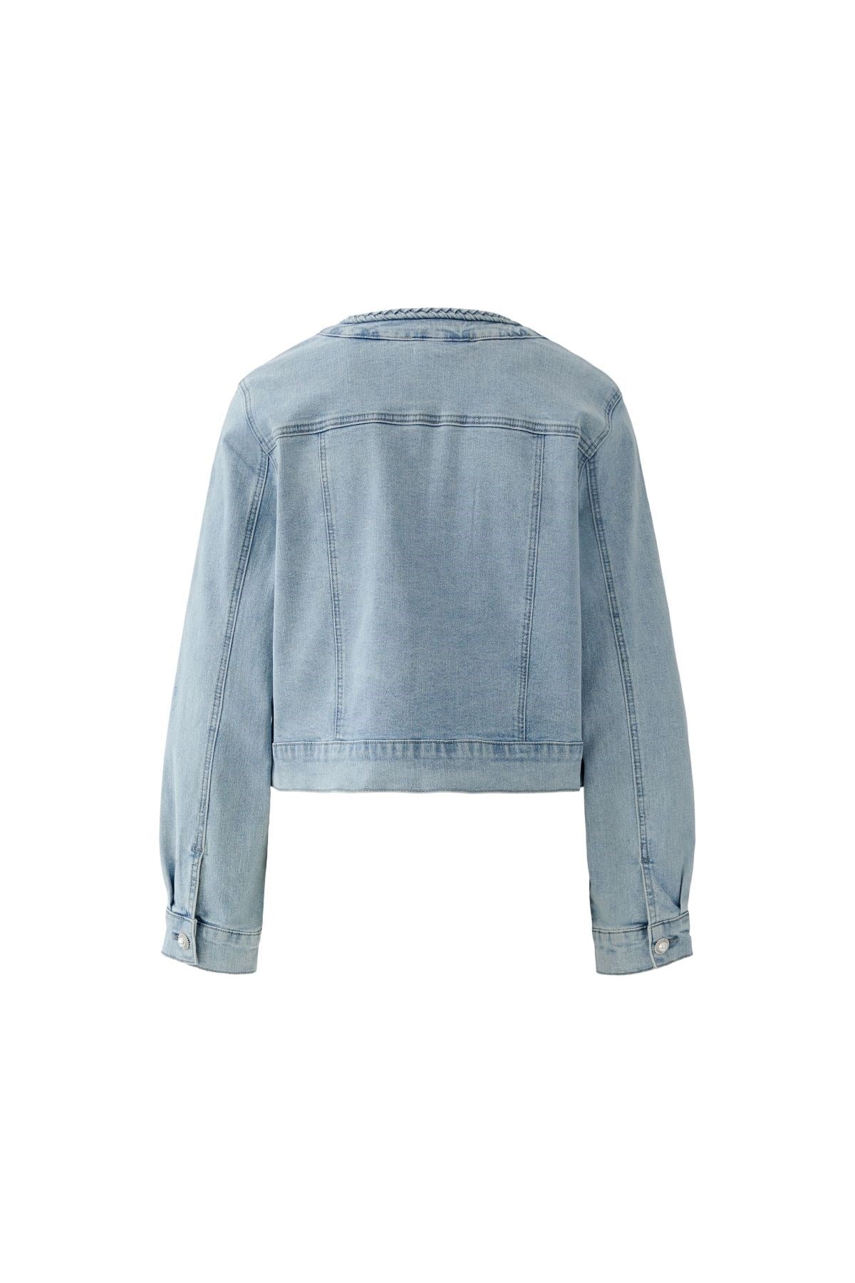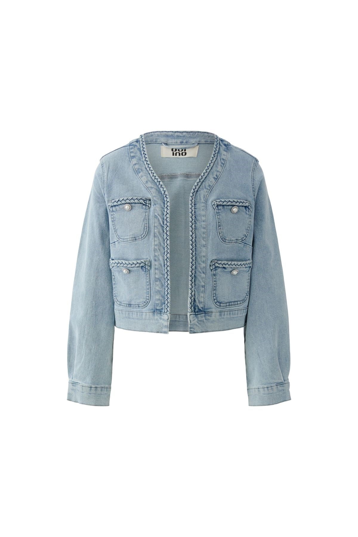 A fresh take on a timeless classic, this cropped denim jacket blends Parisian polish with laid-back edge. Braided trims and pearl-detailed pockets add a touch of elegance to its structured silhouette. The perfect blend of cool and refined for effortless everyday layering.