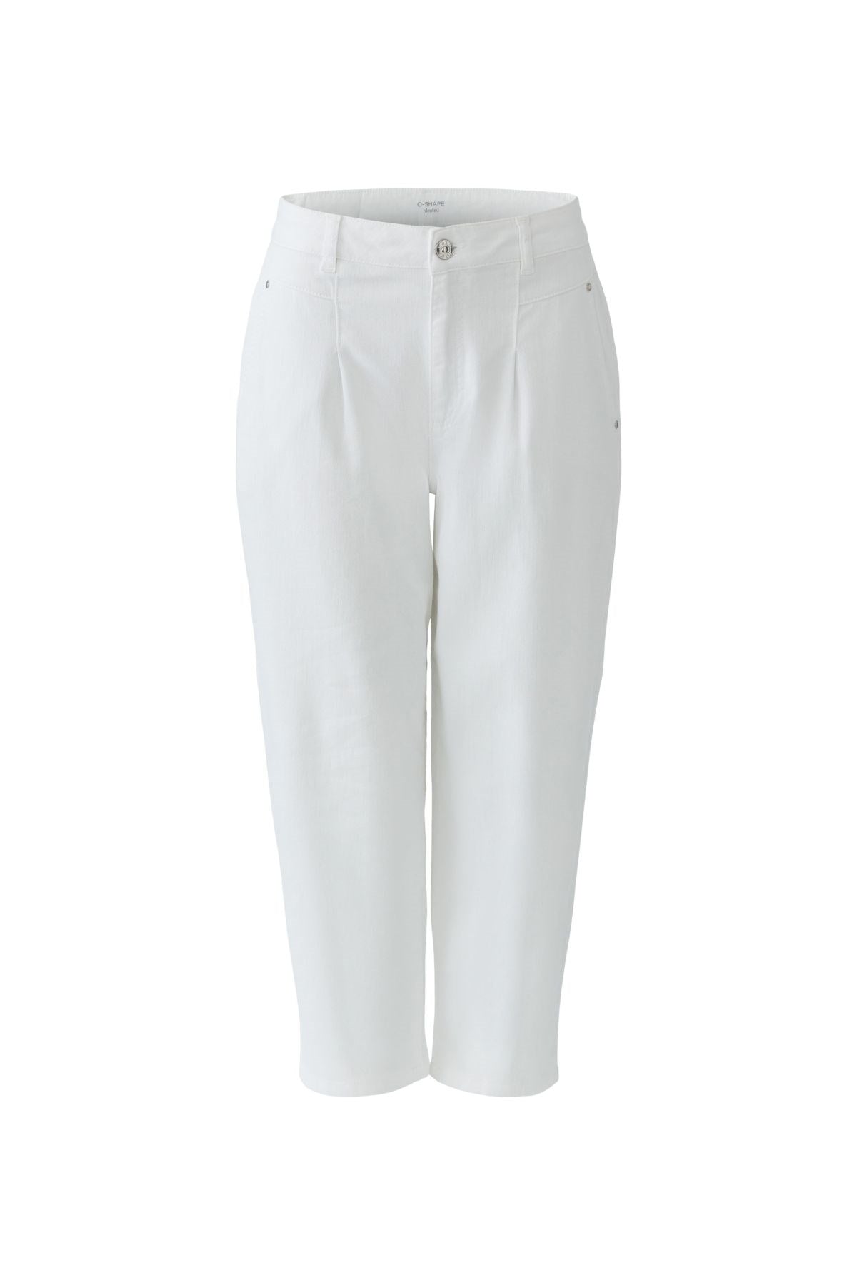 Crisp and effortlessly tailored, these cropped trousers feature gentle front pleats and a softly tapered leg for a flattering silhouette. The mid-rise waist offers all-day comfort with a polished finish. A clean essential for breezy summer outfitting.