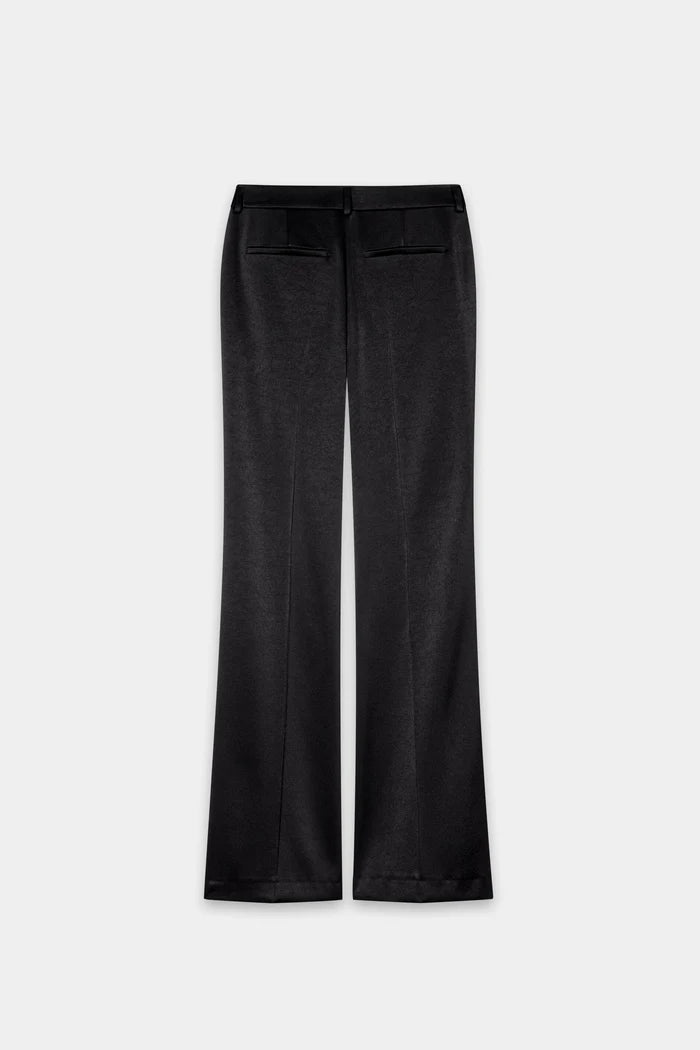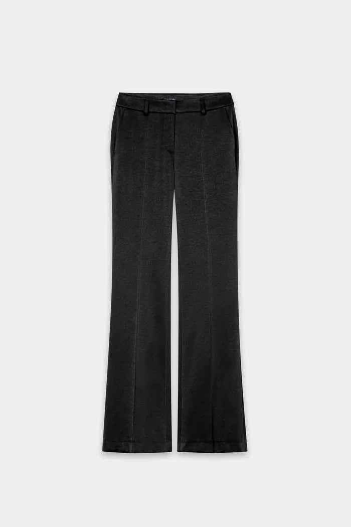 Polished with a hint of sheen, these tailored trousers offer a fluid drape and elegant elongation. The pressed creases and subtle flare lend a timeless silhouette, perfect for both elevated evenings and refined daywear. A luxurious staple with effortless sophistication.