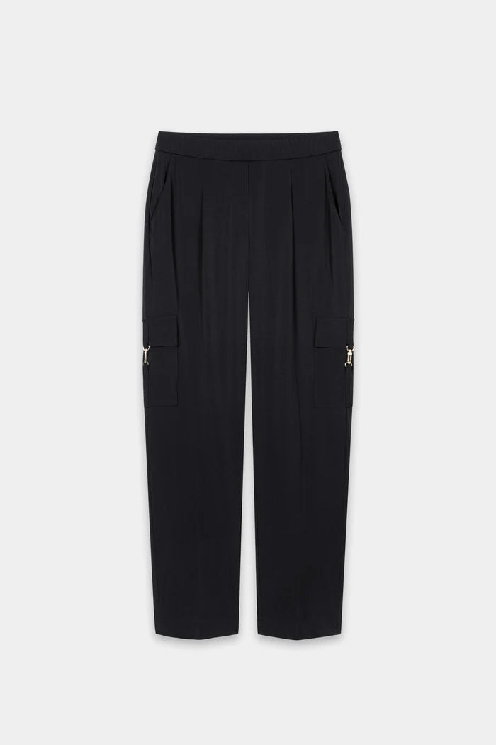 Utility meets elegance in these softly tailored cargo trousers, designed with a relaxed silhouette and gently pressed pleats. The flap pockets are accented with sleek metallic clasps, adding a hint of polish to their functional charm. Effortless for everyday wear, elevated for city chic.