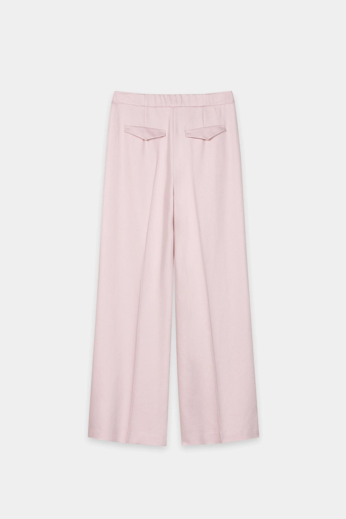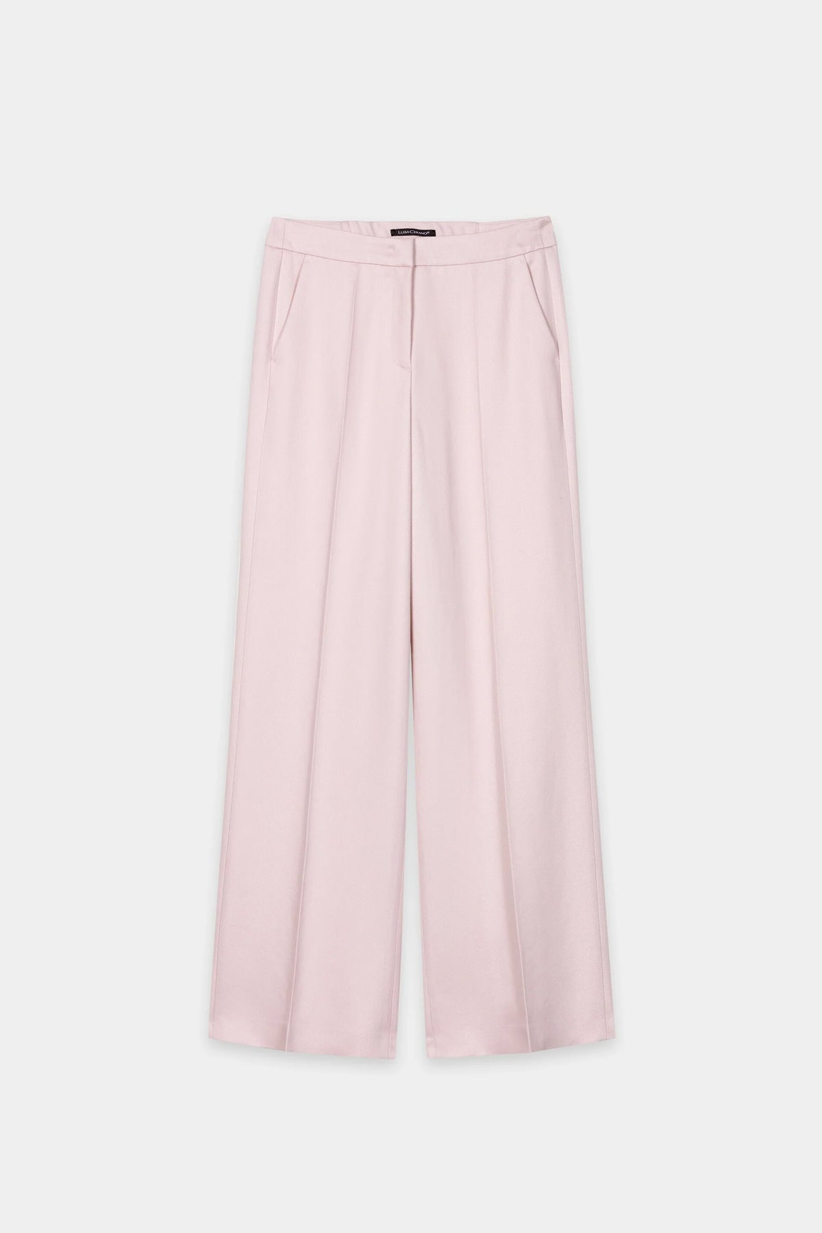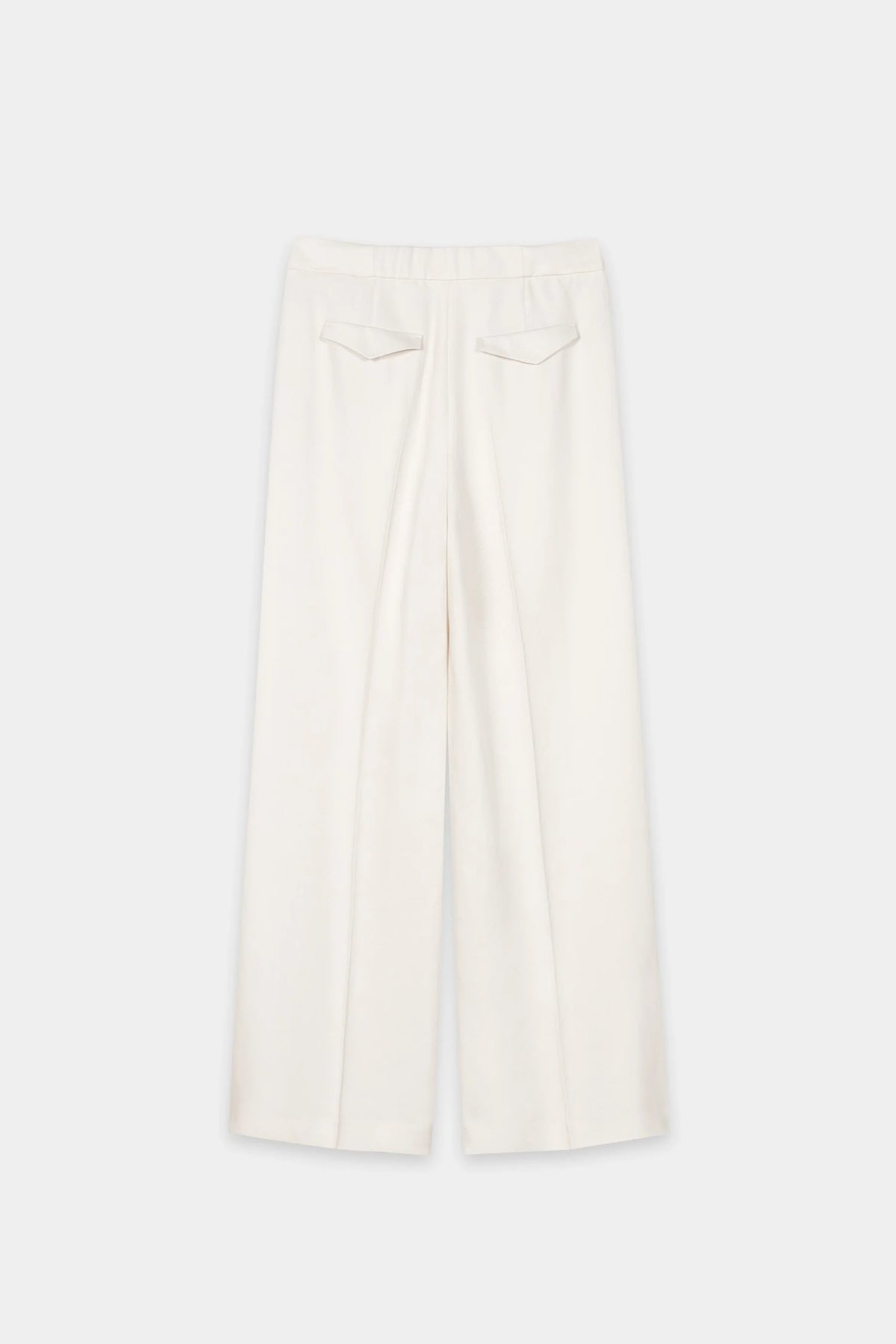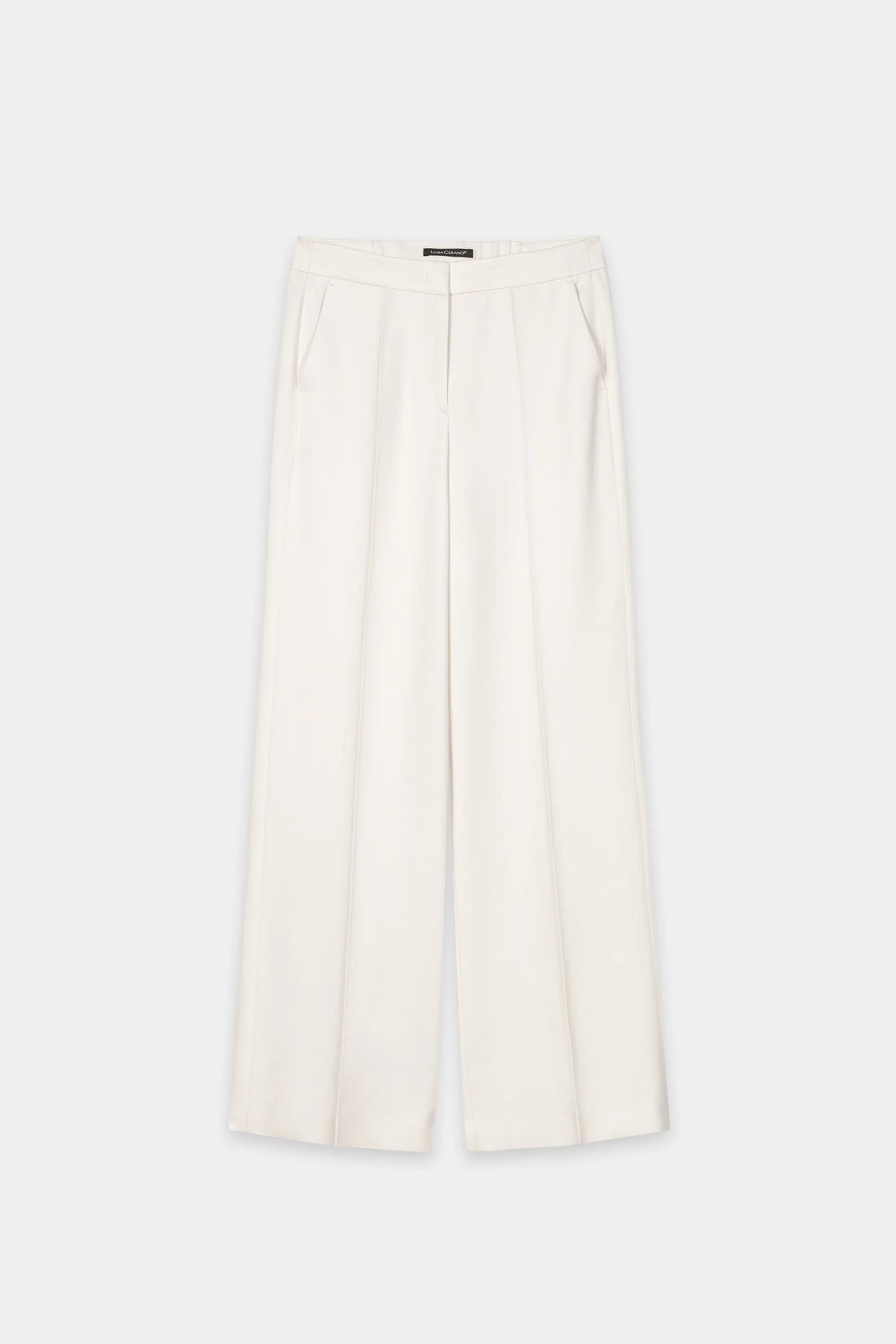 Crisp and refined, these tailored trousers feature a wide-leg silhouette with pressed creases for a clean, elongating effect. The high waist and discreet side pockets add both polish and practicality. A versatile foundation piece for elevated daywear or effortless office elegance.