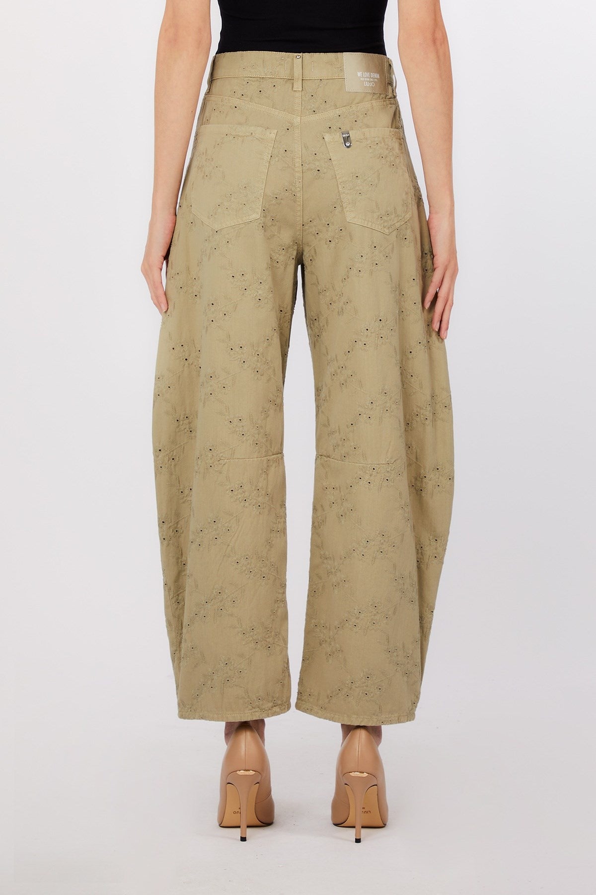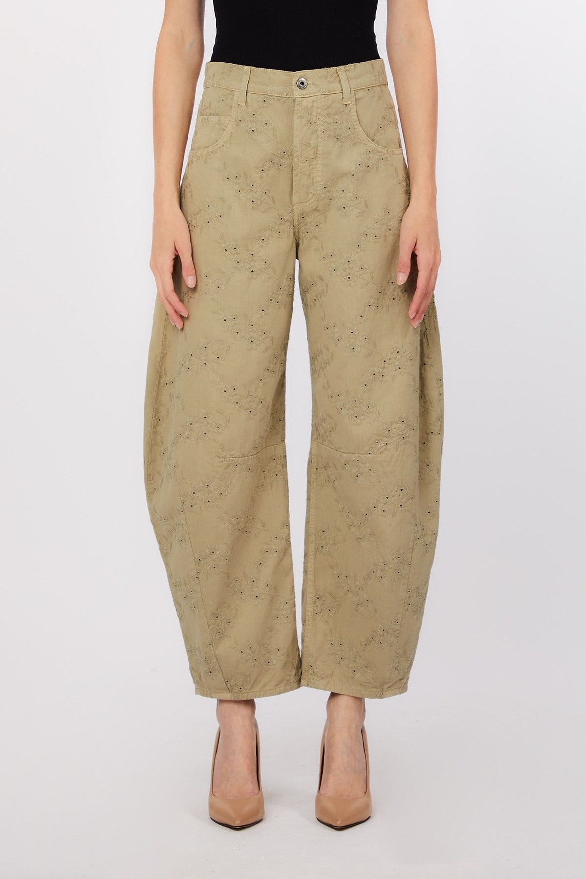 These wide-leg trousers redefine utility with a romantic twist, featuring delicate broderie anglaise embroidery throughout. The softly curved silhouette adds volume without bulk, lending an artful, sculptural shape. Feminine yet functional, they’re a fresh statement for laid-back sophistication.