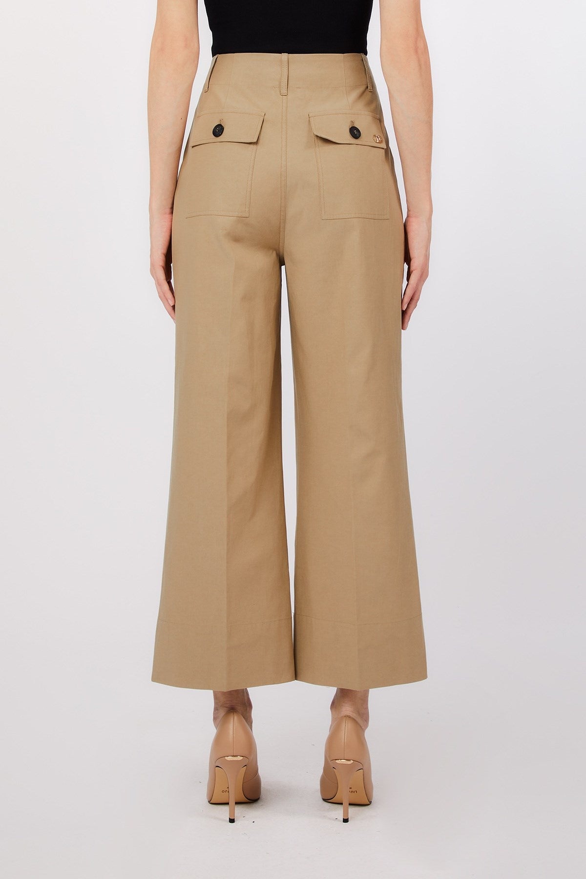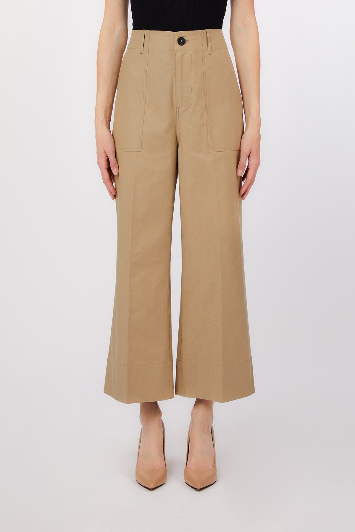 These cropped wide-leg trousers are a masterclass in modern minimalism with a utilitarian twist. Defined by structured patch pockets and sharp tailoring, they strike the perfect balance between relaxed and refined. A wardrobe essential that pairs effortlessly with both crisp shirts and soft knits.