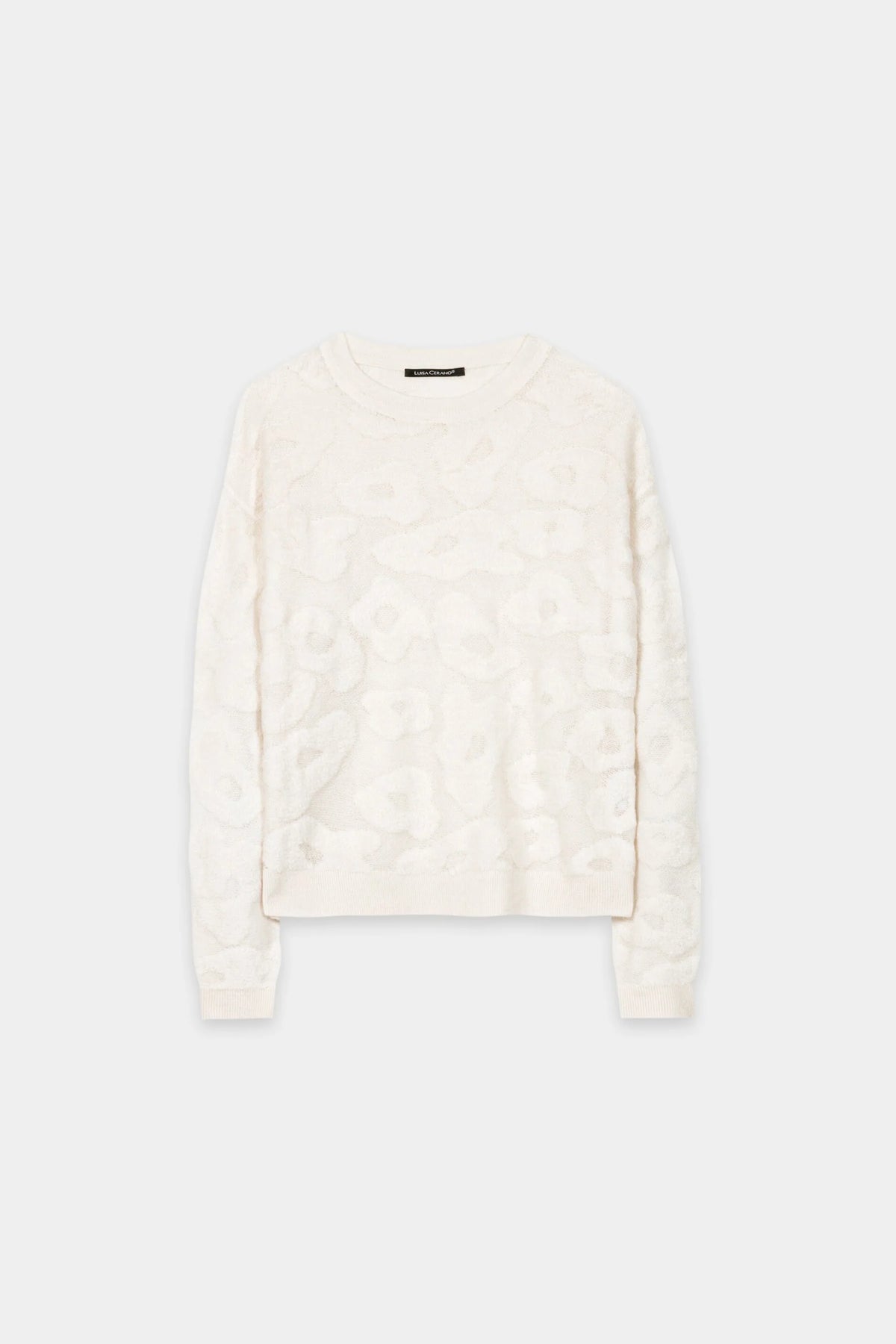 Delicate yet bold, this fine-knit pullover features a subtle floral jacquard pattern that catches the light with texture. With a classic crew neck and slim silhouette, it's perfect for layering or wearing solo. A graceful nod to elegance with a touch of mystery.