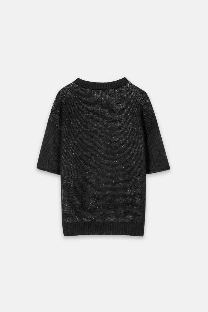 Chic and subtly dazzling, this short-sleeved knit top glimmers with delicate sparkle woven through its airy texture. The classic crew neck and relaxed fit offer an easy elegance. Perfect for dressing up denim or layering under tailoring with a touch of shine.