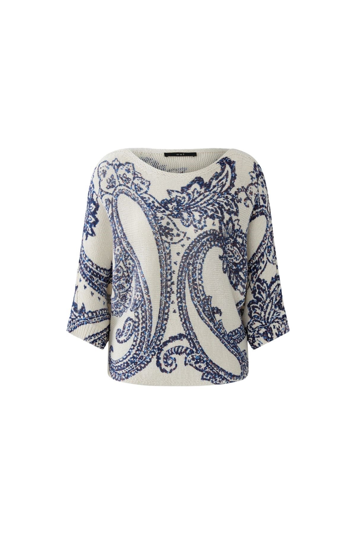 Bold and artistic, this knit top features an oversized paisley motif woven into a relaxed silhouette. The wide neckline and cropped sleeves offer an effortlessly chic drape, blending comfort with statement style. A standout piece perfect for pairing with tailored bottoms or denim alike.