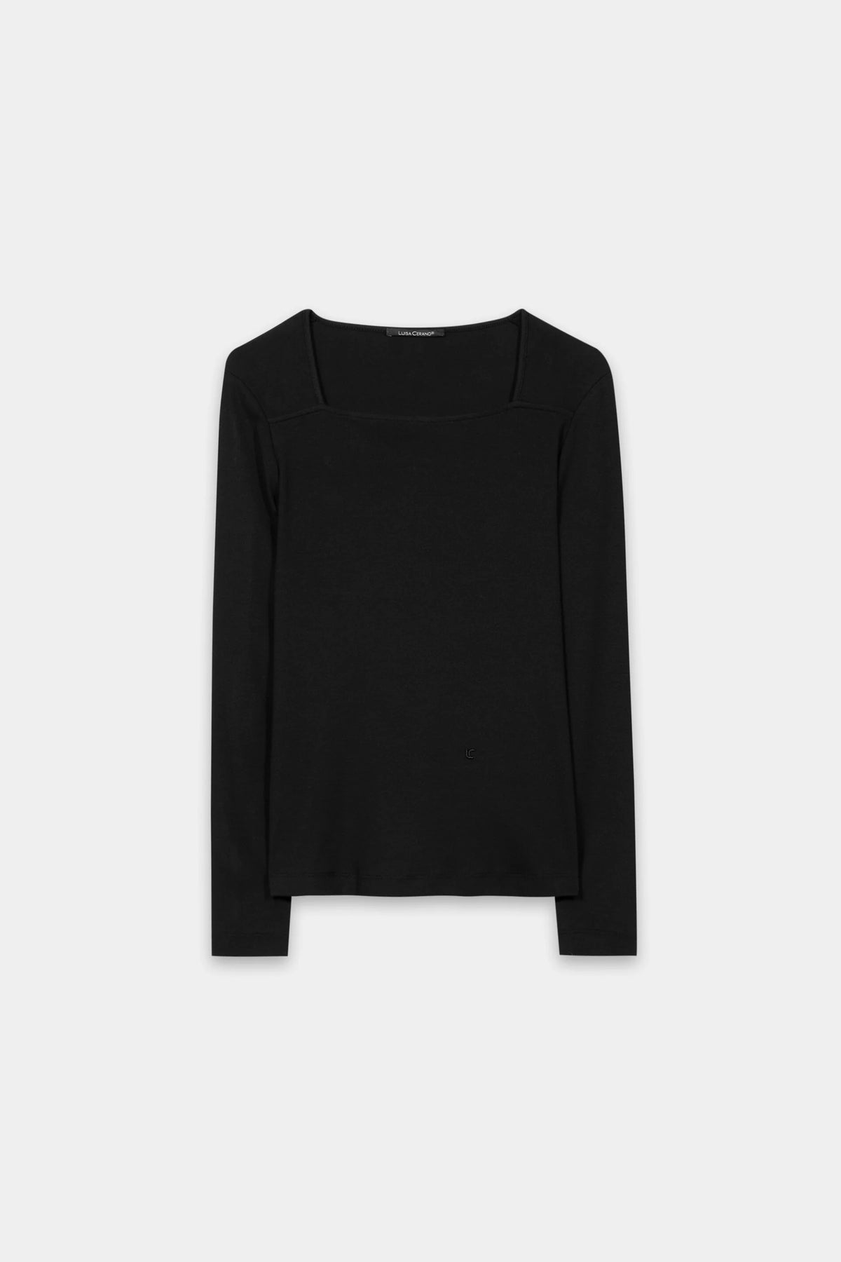 A minimalist essential with modern flair, this long-sleeve top features a refined square neckline that flatters with quiet confidence. Crafted in a soft, stretch-knit fabric, it’s cut for a close fit that layers beautifully or shines on its own. A go-to piece for effortless, everyday elegance.