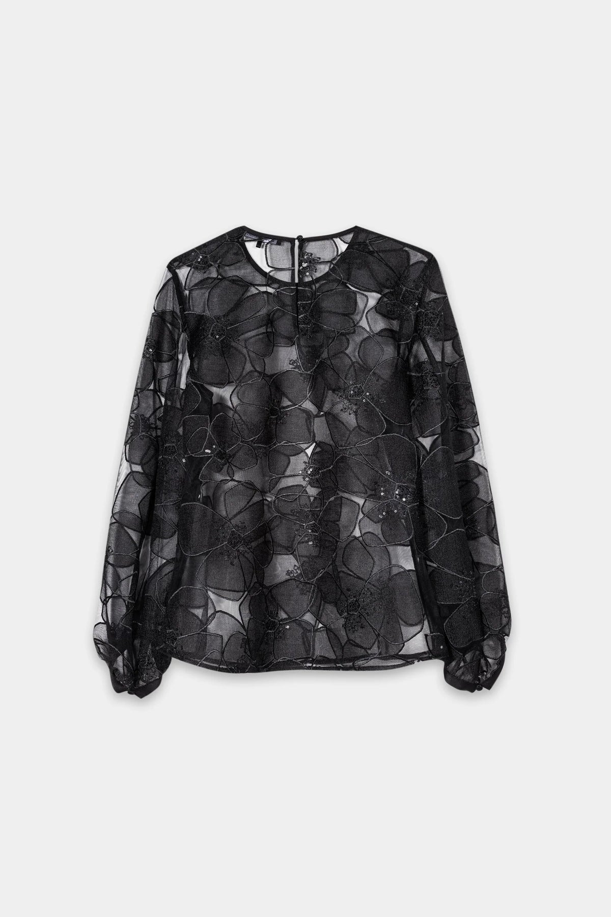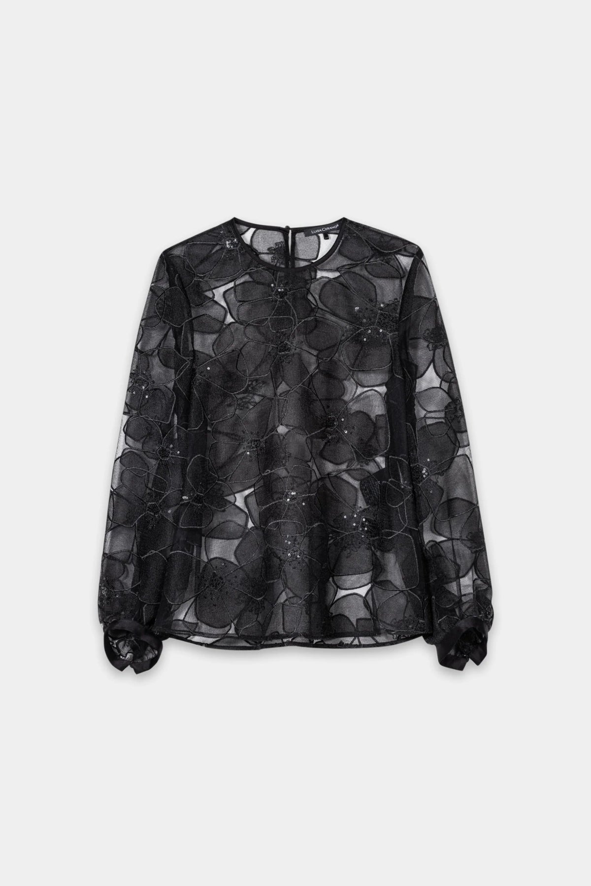 Ethereal and alluring, this sheer blouse is adorned with oversized floral embroidery and scattered sequins for a subtle sparkle. Voluminous sleeves finished with satin bows add a touch of romance. A show-stopping piece that effortlessly elevates any evening look.