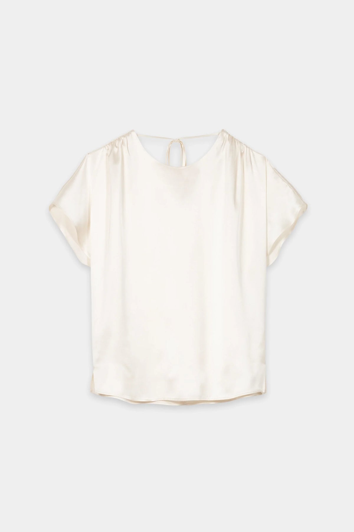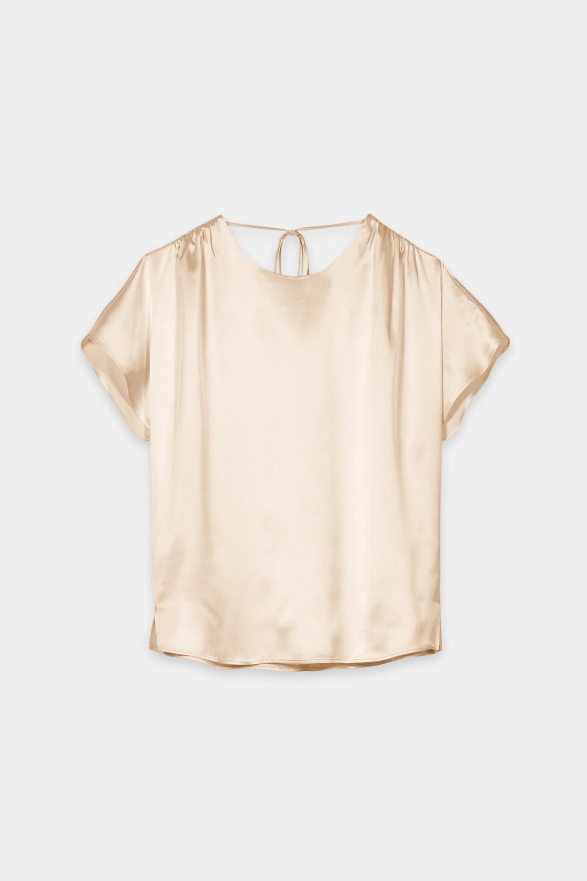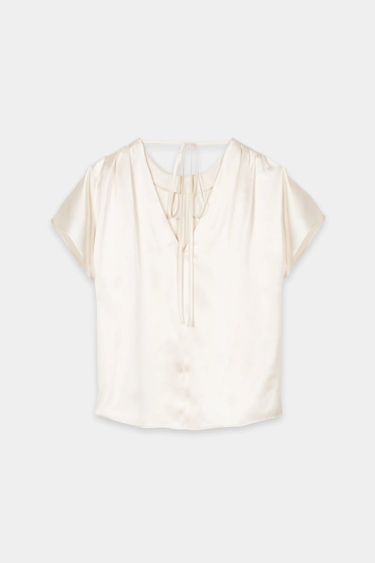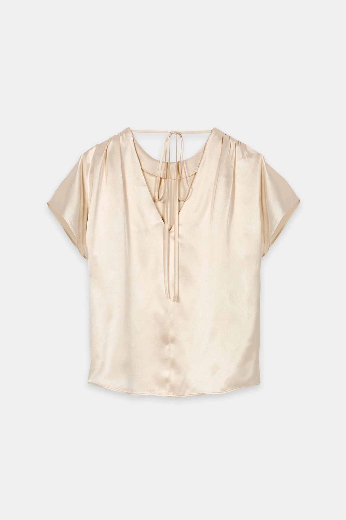 Delicate and fluid, this satin blouse features a graceful tie-back detail and soft gathering at the shoulders. Its breezy silhouette glides effortlessly from day to evening, bringing understated elegance to any occasion. A true wardrobe whisperer.