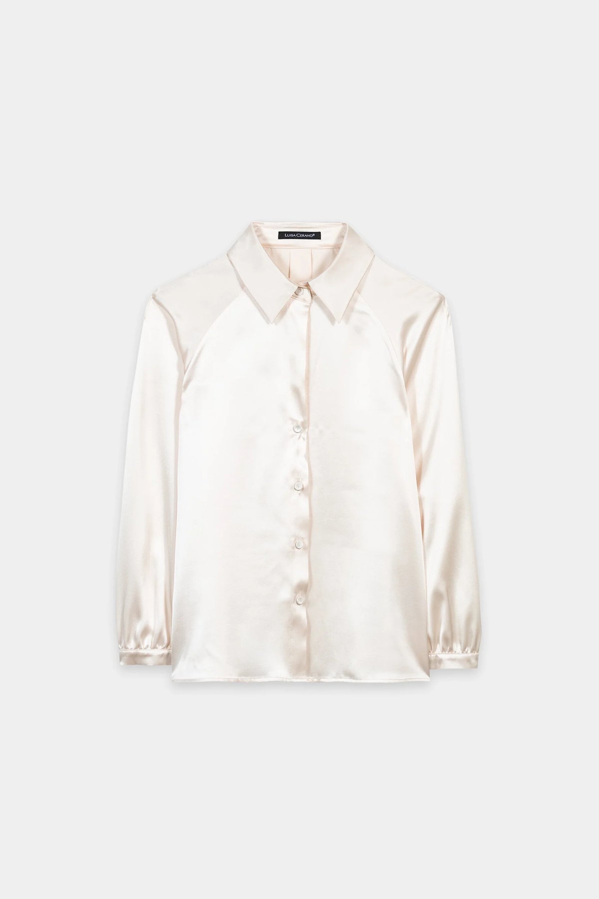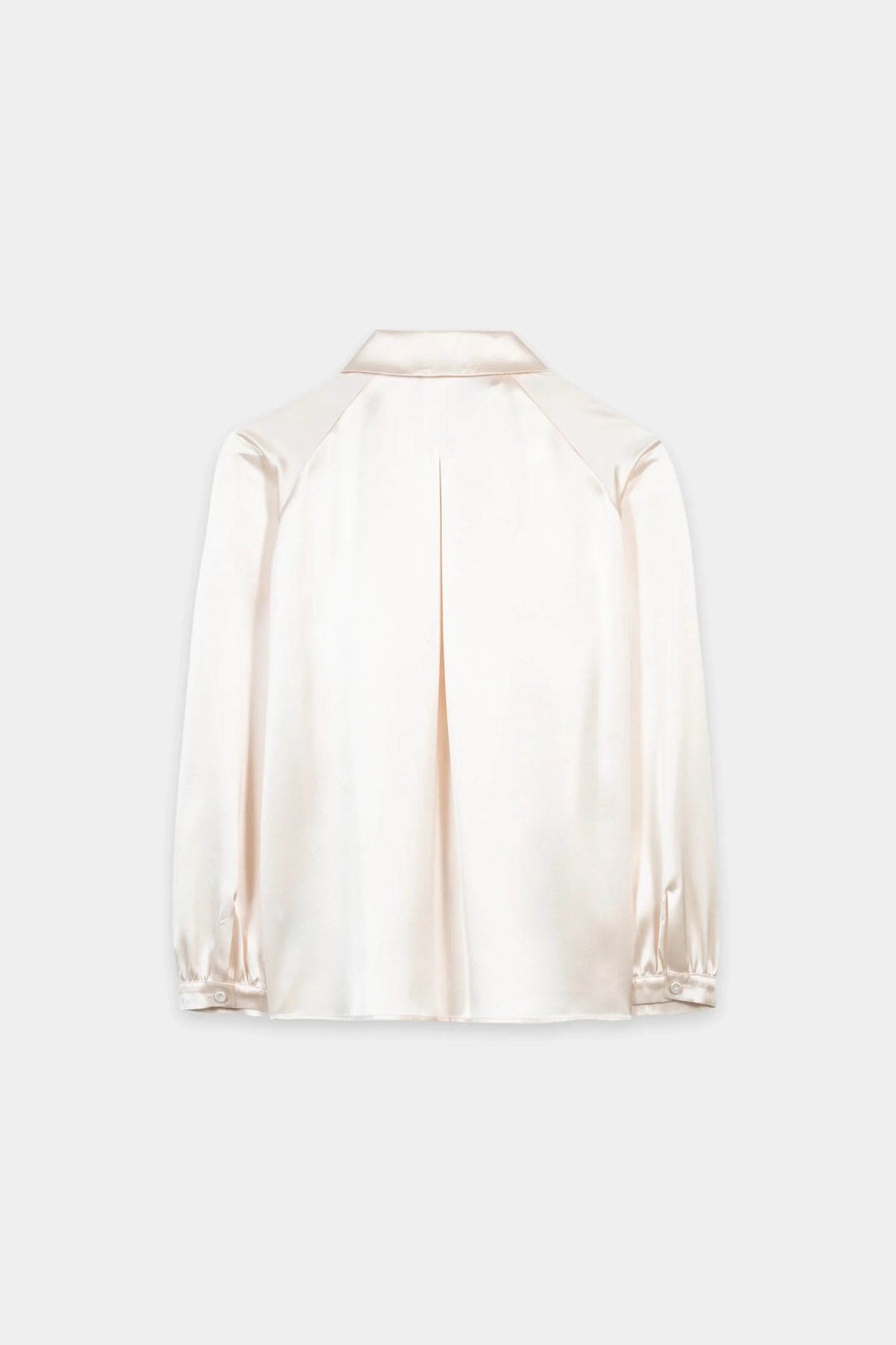 Polished and fluid, this satin blouse brings understated luxury with its lustrous finish and softly structured shape. A sharp collar and relaxed sleeves add effortless sophistication, while subtle gathering at the cuffs lends a delicate touch. Perfect for elevating everyday tailoring or pairing with evening separates.