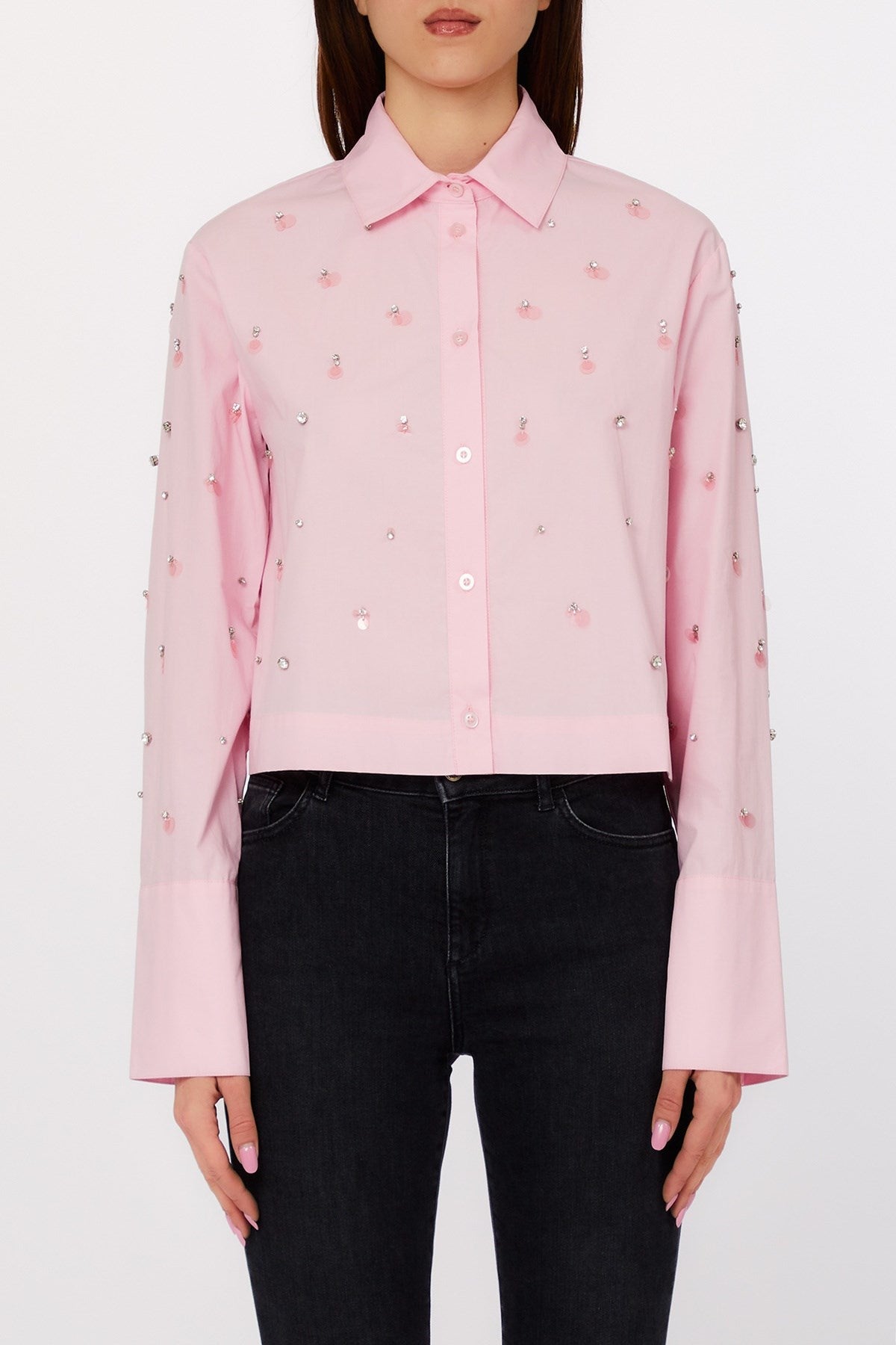 A playful twist on a classic silhouette, this cropped shirt is adorned with scattered gems and delicate sequin appliqués for a touch of sparkle. The wide cuffs and crisp collar balance its charm with tailored sophistication. Ideal for dressing up denim or adding flair to sleek skirts.